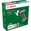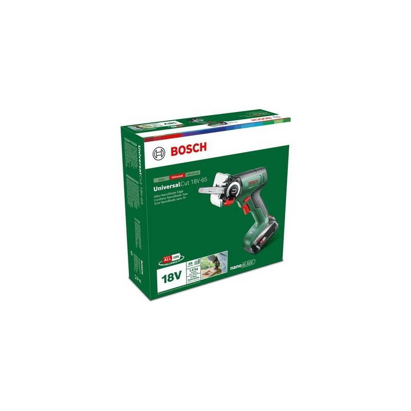 Bosch UniversalCut 18V-65. Kolor produktu: Czarny, Zielony, Silnik: Bezszczotkowy. Skok jałowy (maks.): 8000 spm, Głębokość cięcia drewna: 6,5 cm. Źródło zasilania: Bateria, Technologia baterii: Litowo-jonowa (Li-Ion), Pojemność baterii: 2,5 Ah. Waga produktu: 1 kg, Szerokość produktu: 68 mm, Głębokość produktu: 207 mm. Rodzaj opakowania: Pudełko