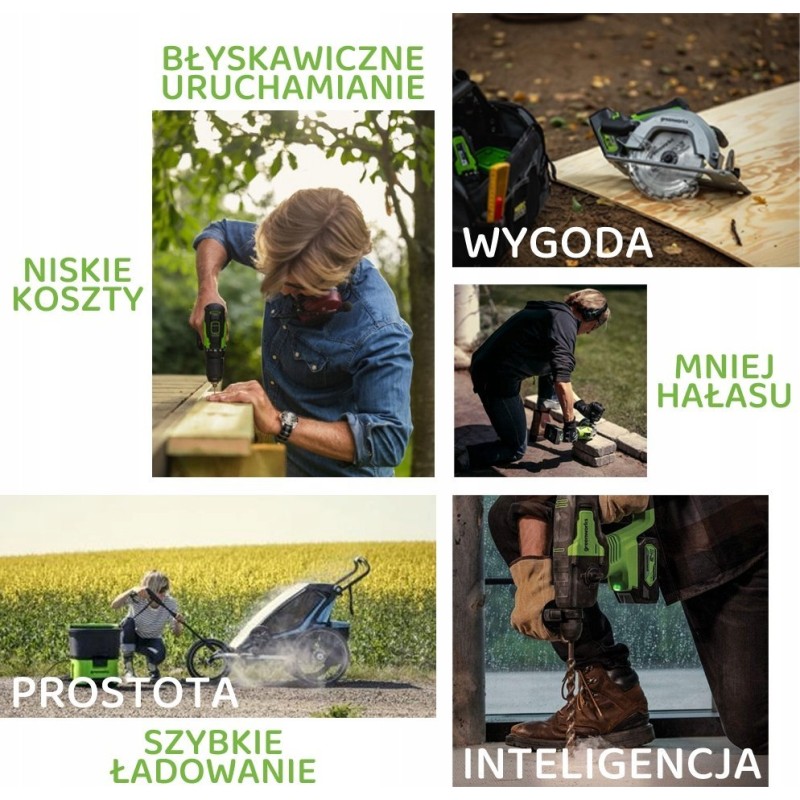- Korzystając z elektronarzędzi akumulatorowych Greenworks, otrzymujesz wysoką moc i efektywność.