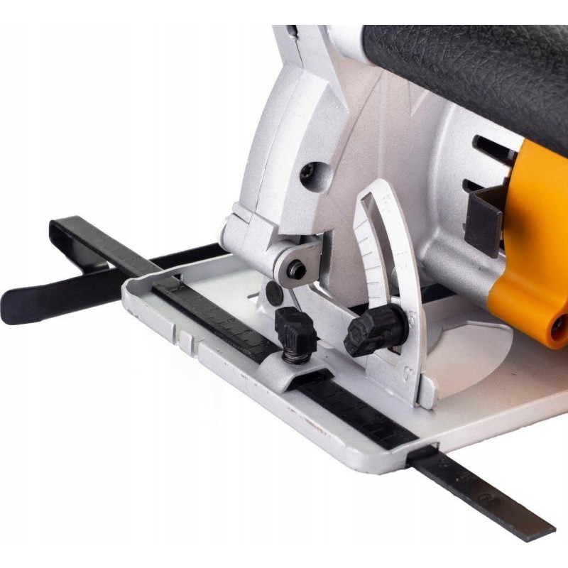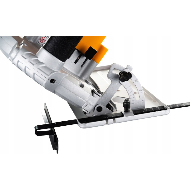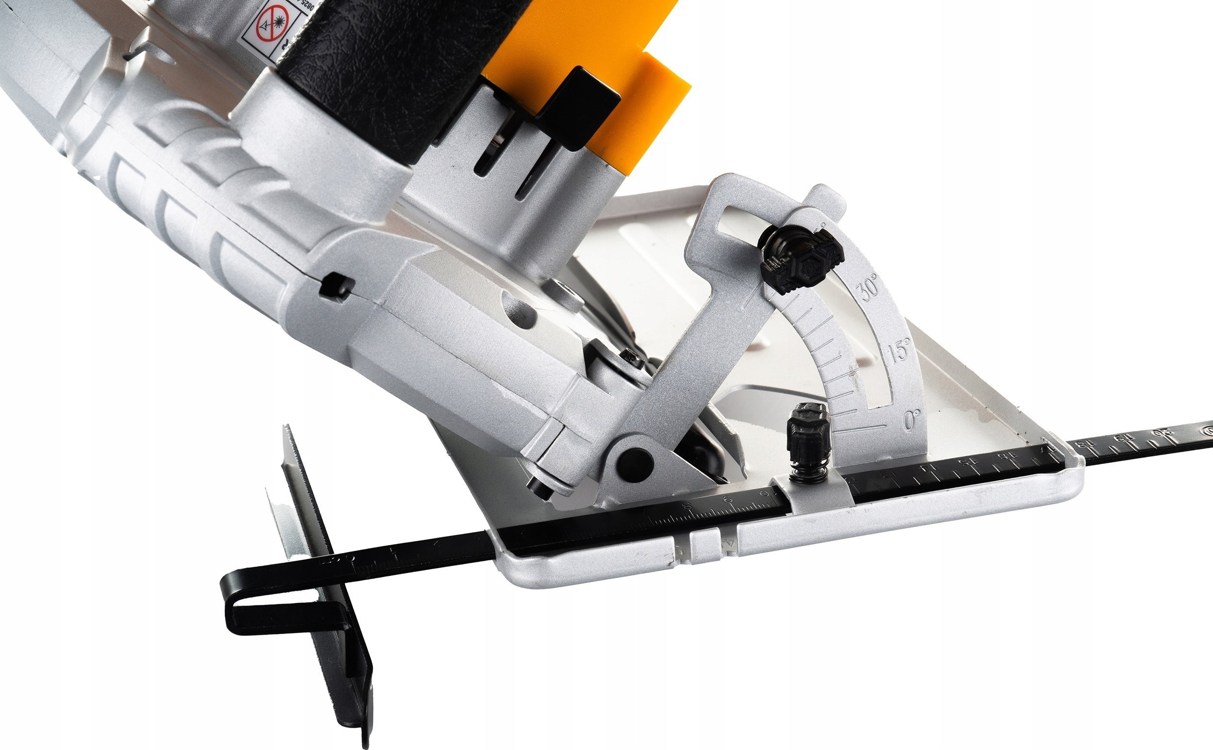 Piła posiada metalową podstawę, która umożliwia regulację kąta cięcia (0-45°) oraz dostosowanie głębokości cięcia do indywidualnych zastosowań (0-65mm). Urządzenie posiada zintegrowany laser, który wyświetla linię cięcia, co pozwala na precyzyjną pracę. Antypoślizgowa rękojeść zapewnia pewny chwyt oraz umożliwia wygodne użytkowanie.