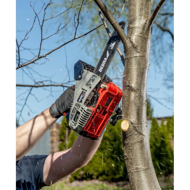 Wyposażona w silnik o pojemności 25,4 cm³, pilarka DEDRA zapewnia znakomitą moc oraz efektywność pracy. Dwusuwowy, jednocylindrowy silnik chłodzony powietrzem gwarantuje długotrwałe użytkowanie, a maksymalna prędkość obrotowa wynosząca 11500 obr/min sprawia, że cięcie jest szybkie i bezproblemowe.