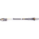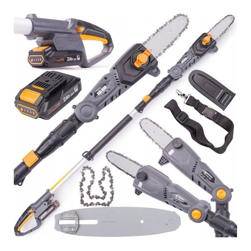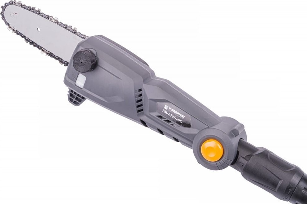 Pilarka elektryczna na wysięgniku z cztero stopniową regulacją pochylenia firmy POWERMAT PM-APW-20C z wysokiej jakości prowadnicą i łańcuchem profesjonalnej marki OREGON. Możliwość szybkiej i łatwej regulacji długości wysięgnika w zakresie od 172 cm do 240 cm oraz możliwość regulacji kąta nachylenia głowicy tnącej w czterech stopniach bardzo ułatwia przycinanie drzewek. Silnik elektryczny na akumulator 20V - 2Ah umożliwia cięcie grubych gałęzi dzięki zapasowi mocy. Długość prowadnicy to 20 cm a długość robocza to 18 cm. Piła wykonana jest z wysokiej jakości materiałów, co zapewnia dobrą stabilność i co za tym idzie, mniejsze zmęczenie podczas pracy. Piła posiada automatyczny system smarowania łańcucha. Poziom oleju można łatwo sprawdzić poprzez przezroczysty wskaźnik. Dużą zaletą piły jest jej waga tylko 3,25 kg. Prędkość łańcucha 5 m / s.