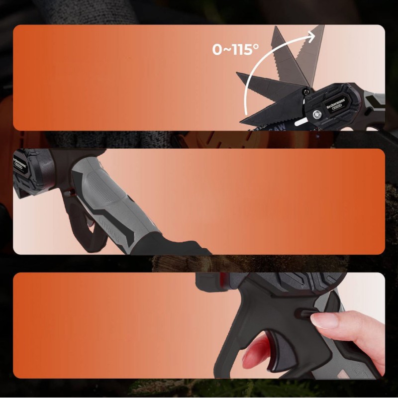 ⭐ Mini piła łańcuchowa akumulatorowa jest niewielka i posiada wygodny, antypoślizgowy uchwyt, co sprawia, że praca z urządzeniem jest bardzo komfortowa.