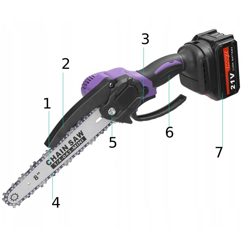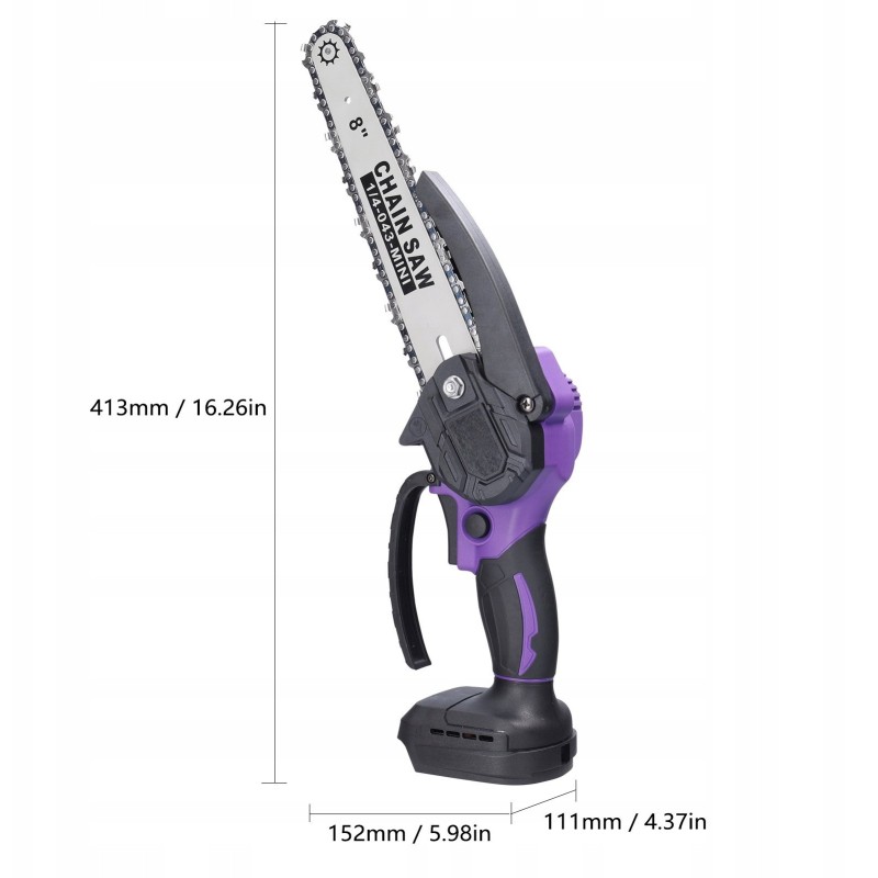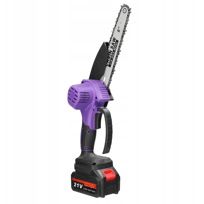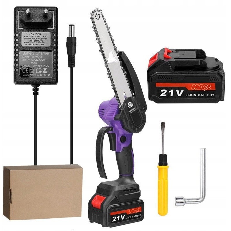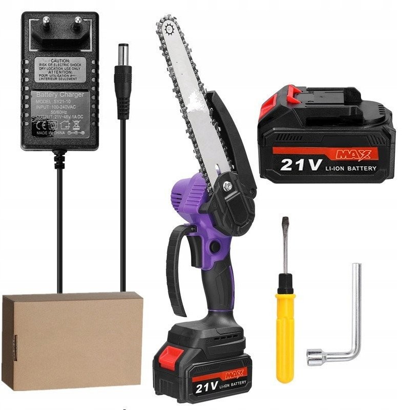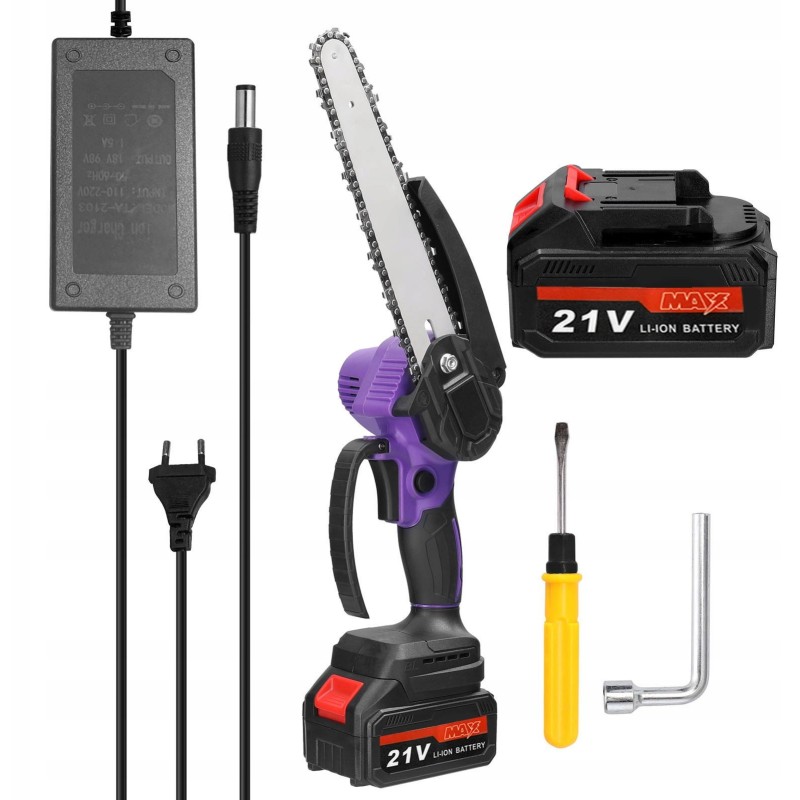 - Zawartość zestawu: piła łańcuchowa, łańcuch z głowicą 8 cali, 2x akumulator, ładowarka, zabezpieczenie przed odłamkami, śrubokręt, klucz, instrukcja obsługi w języku polskim.