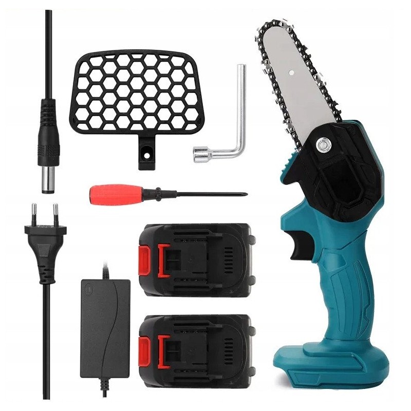 W skład zestawu wchodzi nie tylko piła łańcuchowa, ale także łańcuch z głowicą 4,5 cala, ładowarka sieciowa, śrubokręt, klucz oraz osłona przed odłamkami. Dzięki temu masz wszystko, co potrzebne do rozpoczęcia pracy od razu po zakupie.