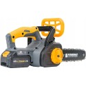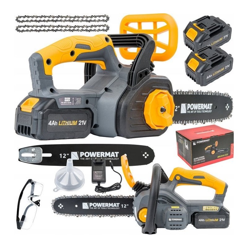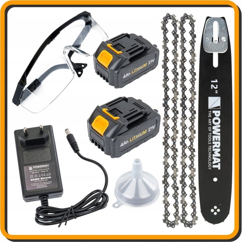 - Zawartość zestawu: 2x łańcuch, 2x akumulator 4Ah, gogle ochronne, lejek, ładowarka akumulatorowa, prowadnica