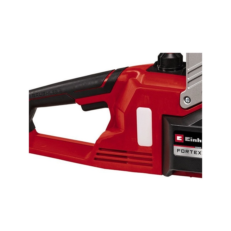 Należy do rodziny Power X-Change. Urządzenie jest zasilane przez silnik bezszczotkowy Einhell PurePOWER. Ten bezszczotkowy silnik oferuje większą moc i dłuższy czas pracy niż konwencjonalne silniki ze szczotkami węglowymi. Po rejestracji online, silnik bezszczotkowy objęty jest 10-letnią gwarancją. W połączeniu z wysokiej jakości prowadnicą i łańcuchem OREGON nawet grube gałązki i gałęzie nie stanowią zagrożenia dla FORTEXXA. Bezprzewodowa wersja piły łańcuchowej sprawdza się również podczas pracy z drewnem, kantówką i drewnem opałowym. Obsługę ułatwiają napinacz łańcucha, który można regulować bez użycia narzędzi oraz równie prosta wymiana łańcucha.