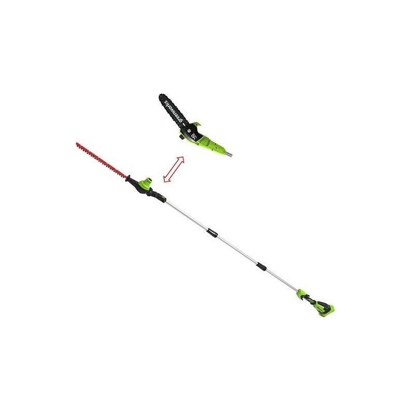Wielofunkcyjne urządzenie łączące w sobie pilarkę i nożyce do żywopłotu. Wyposażone w prowadnicę o długości 20 cm, nożyce o długości 51 cm i 3-częściowy wysięgnik (do 2,4 m wysokości) pozwala na komfortowe obcinanie gałęzi i wysokich żywopłotów.