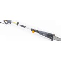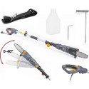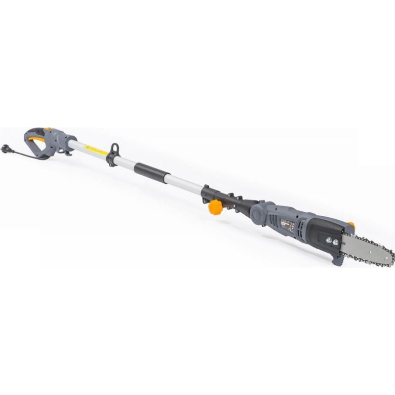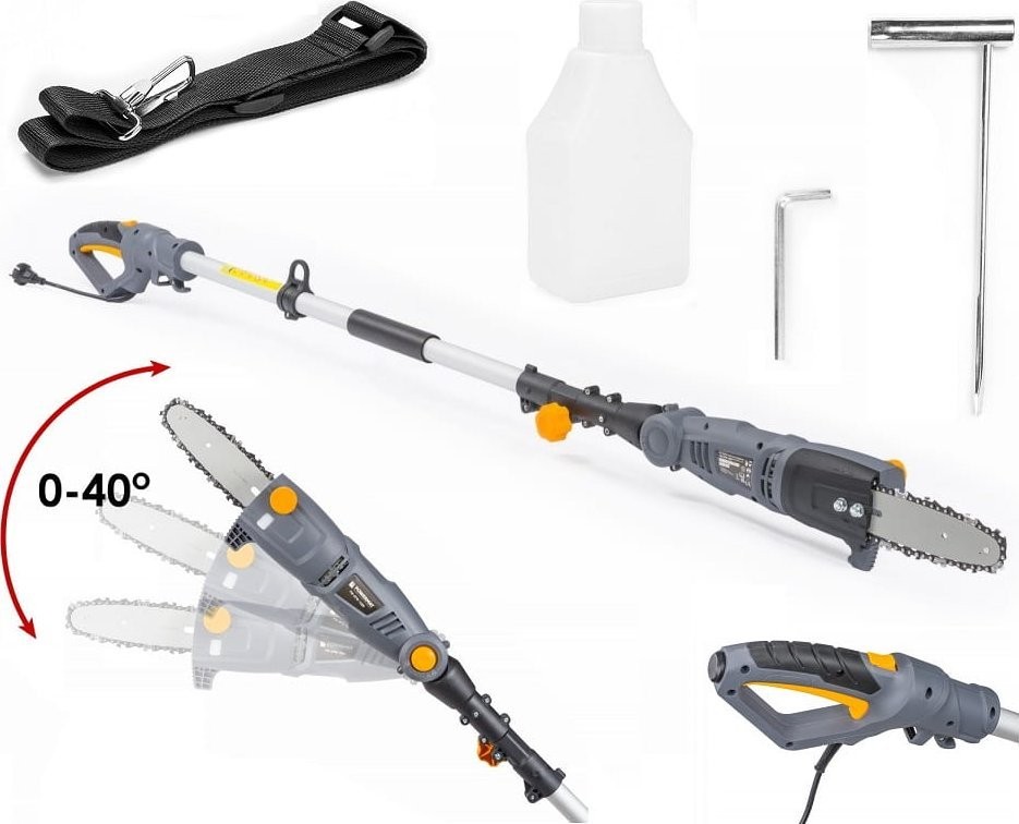 Pilarka elektryczna posiada trzy stopniową regulację pochylenia. Zastosowany system blokowania pochylenia bez narzędzi ułatwia regulację w 3 stopniach. Aby pochylić piłę, wystarczy nacisnąć duży guzik oraz ustawić pochylenie, a następnie puścić guzik. Regulacja bez konieczności dokręcania jest wygodną i szybką metodą pochylenia. Piła posiada przewód o długości 15 cm, co ułatwia przechowywanie urządzenia. Piła również wyposażona jest w system zabezpieczający, przed przypadkowym załączeniem. Regulowana długość sztycy w zakresie 185cm do 240cm ułatwia dostosowanie odpowiedniej długości urządzenia oraz dotarcie nim do bardziej niedostępnych miejsc. Do zestawu załączony jest pasek do zawieszenia urządzenia. Gdy piła zawieszona jest na ramieniu, znacząco odciąża ręce a długa praca nie jest tak męcząca.