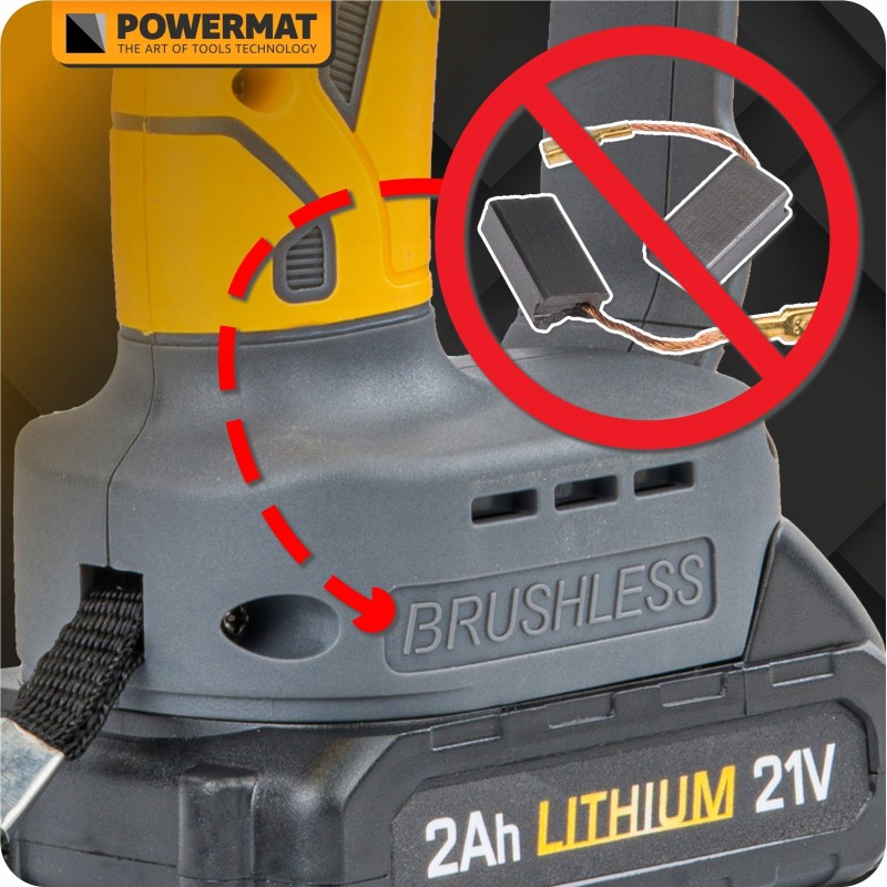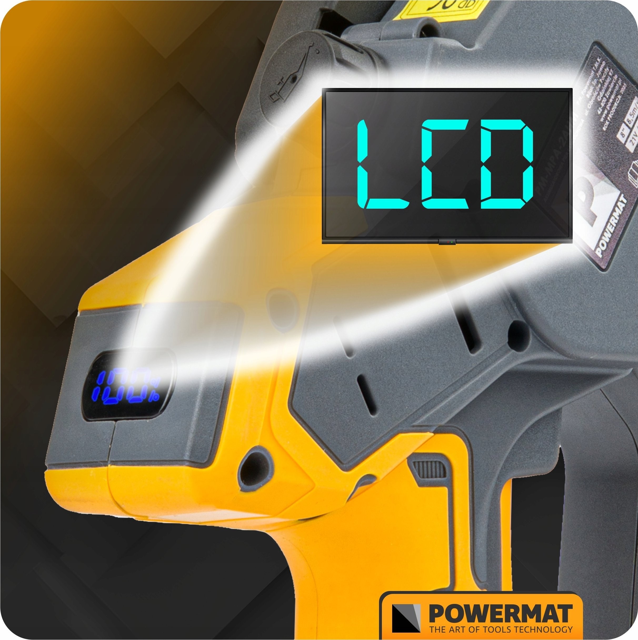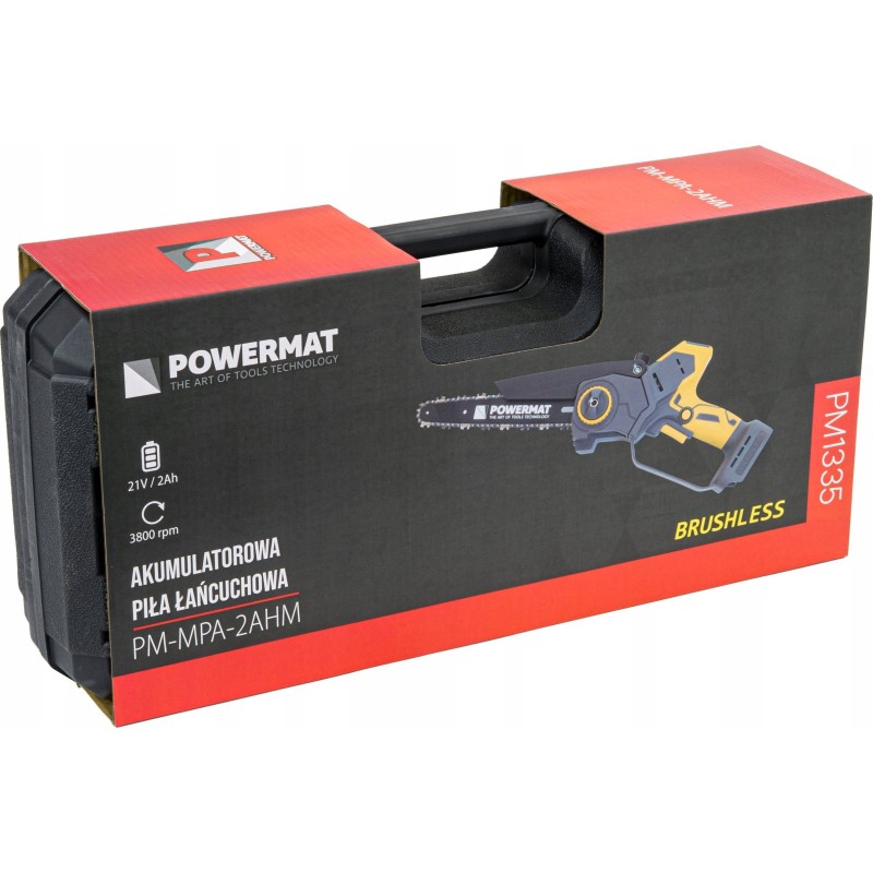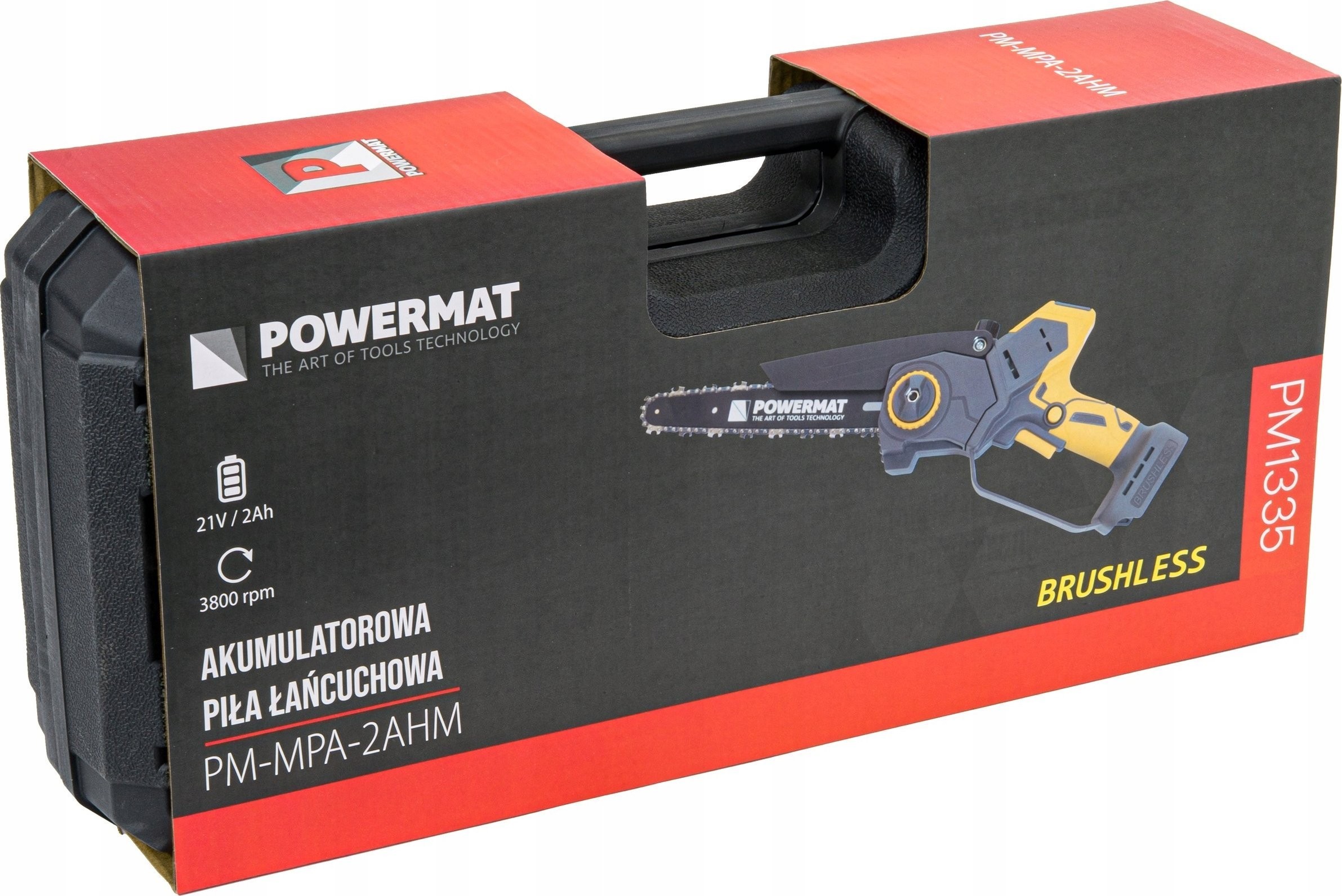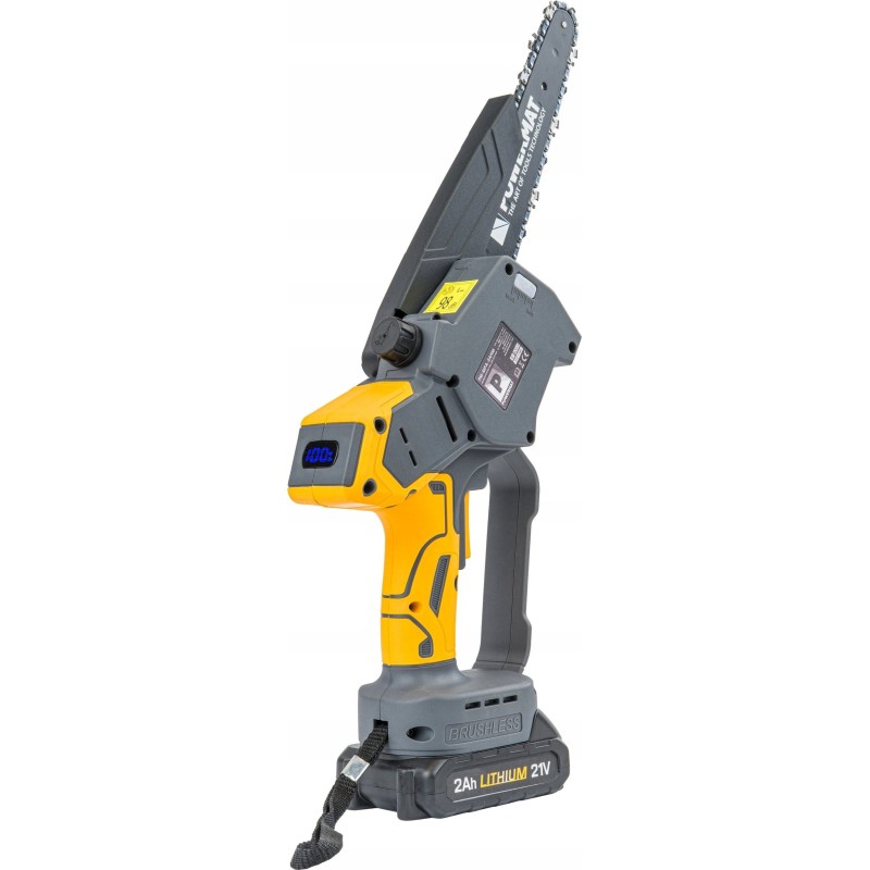 Piła łańcuchowa Powermat wyposażona jest w nowoczesny silnik bezszczotkowy, który nie tylko zwiększa wydajność, ale także wydłuża żywotność urządzenia. Dodatkowo, innowacyjny wyświetlacz LCD informuje o poziomie naładowania akumulatora w czasie rzeczywistym, co pozwala na lepsze zarządzanie pracą.