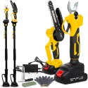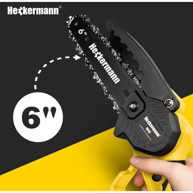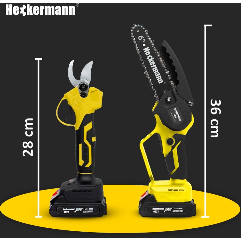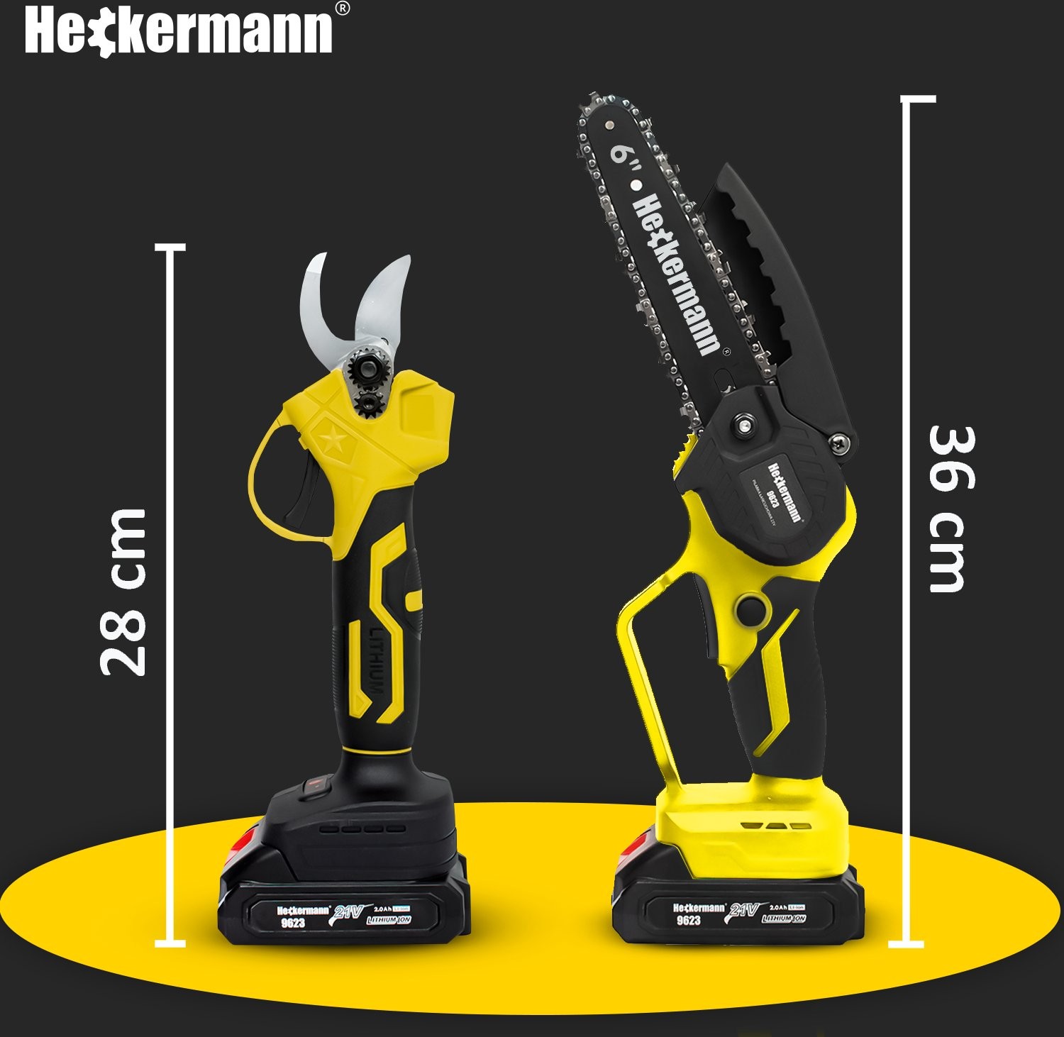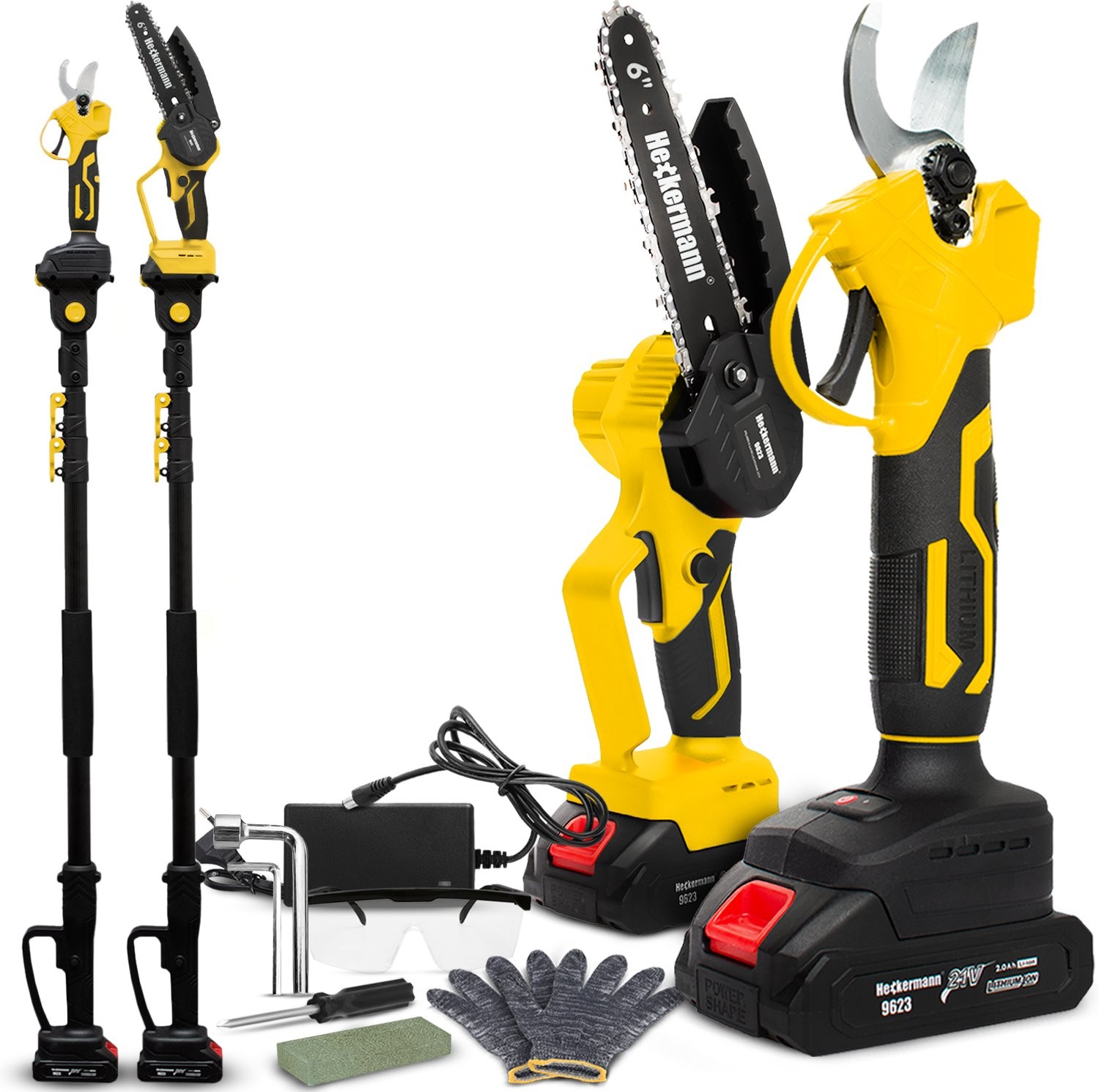 Zestaw 3 w 1! Mini piła łańcuchowa akumulatorowa Heckermann 6" + Sekator akumulatorowy + Tyczka przedłużająca do 2 metrów!