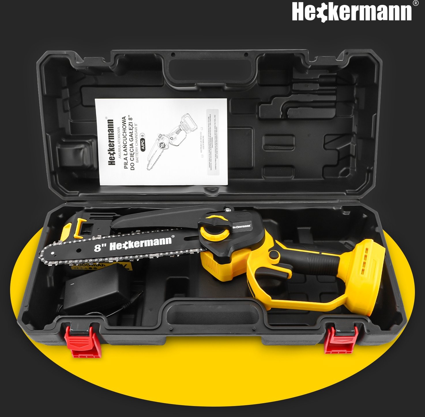 - W zestawie: akumulator, ładowarka, łańcuch z prowadnicą, walizka transportowa.