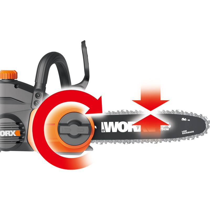Kupując sprzęt firmy Worx, nabywasz produkt świetnej jakości, który zapewnia ulepszenia, wpływające na wygodę użytkowania. Pilarkę cechuje automatyczny system naciągu łańcucha. Gwarantuje to, że napięcie podczas dokręcania pozostanie odpowiednio dostosowane. Nie bez znaczenia jest opcja automatycznego smarowania. Poziom oleju łatwo oszacujesz dzięki widocznemu na urządzeniu okienku, więc nigdy nie zaskoczy Cię jego brak i będziesz mógł w porę go uzupełnić.