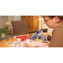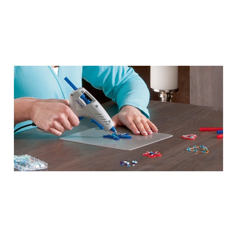 Dremel 930 to pistolet do klejenia o dwóch ustawieniach temperatury, dedykowany do zastosowań specjalistycznych. Przy ustawieniu niskiej temperatury narzędzie można wykorzystać do wielu prac hobbystycznych, takich jak scrapbooking, dekorowanie, ozdabianie szkła kolorowym klejem itp. Załączone siedmiomilimetrowe kolorowe sztyfty kleju* pomogą Ci stworzyć przepiękne dekoracje. Przy klejeniu ceramiki, drewna, tworzyw, szkła i innych prac w domu stosować ustawienie wysokiej temperatury. Precyzyjna końcówka zabezpiecza przed wyciekiem kleju na obrabiany przedmiot. *Uwaga: W 2016 roku do pistoletu do klejenia Dremel 930 Glue Gun będą dołączane kolorowe sztyfty kleju zamiast brokatowych.