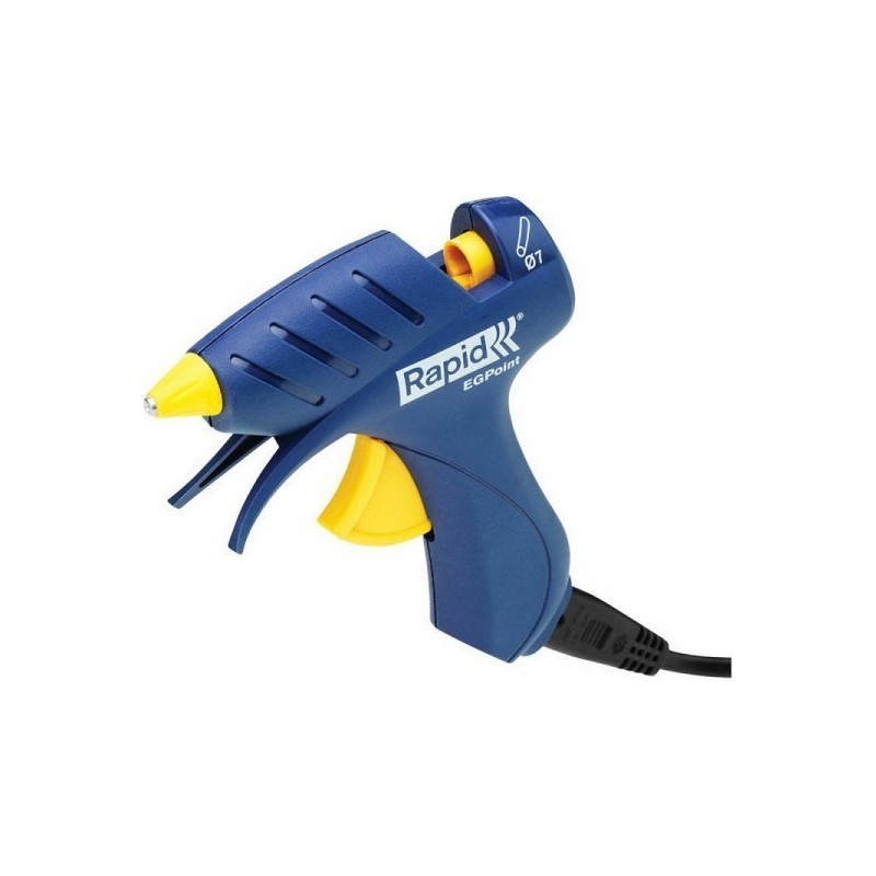 Rapid EG Point. Typ produktu: Pistolet na gorący klej, Kolor produktu: Niebieski, Żółty, Materiał obudowy: Kopolimer akrylonitrylo-butadieno-styrenowy (ABS), Metal. Wyjście kleju: 1,3 g/min, Średnica wkładu klejącego: 7 mm. Źródło zasilania: Prąd przemienny, Napięcie wejściowe AC: 220-240 V. Szerokość produktu: 45 mm, Głębokość produktu: 180 mm, Wysokość produktu: 200 mm. Czas nagrzewania: 5 min, Moc: 80 W