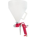 Pistolet tynkarski 45260 znacznie ułatwia i przyspiesza pracę związaną z nakładaniem tynków ozdobnych. Chropowate powierzchnie tynków metodą natryskową są bardziej równomierne i powtarzalne, dlatego efekt końcowy wizualnie wygląda znacznie lepiej. W porównaniu do klasycznej metody nakładania struktury, zużywane jest nawet o 40% mniejsza ilość tynku. Półotwarty zasobnik o pojemności 5l w łatwy i szybki sposób pozwala na uzupełnianie materiału. 3 dysze w zestawie o średnicy 4, 6 oraz 8mm umożliwiają nakładanie struktury o różnej granulacji od drobnych po gruboziarniste powłoki. Łącznik gumowy pistoletu ze zbiornikiem pozwala na dotarcie do trudnodostępnych miejsc, narożników oraz wgłębień. Pistolet wyposażony jest zawór kulowy odcinający powietrze zapobiegając zasychaniu tynku podczas chwilowej przerwy w natryskiwaniu. Pistolet oraz dysze można w bardzo łatwy sposób myć wodą co pozwala na wielokrotne użycie tej samej dyszy. Pokrętło regulacji umożliwia dostosowanie pistoletu do różnych mas tynkowych.
