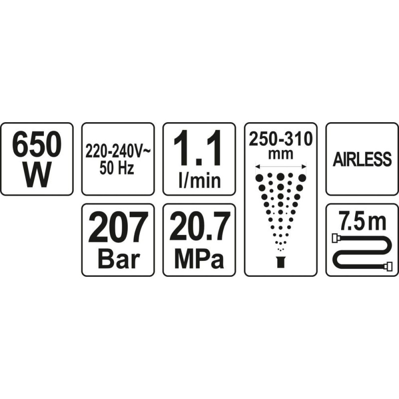 Hydrodynamiczny agregat malarski o mocy 650W i ciśnieniu 207 Bar. Posiada funkcję regulacji strumienia natrysku w zakresie 250-310mm. Agregat wyposażony w wąż o długości 7,5 metra, dzięki czemu narzędzie posiada duży zakres pracy, co zdecydowanie poprawia komfort pracy. Urządzenie posiada pompę pobierającą farbę z dowolnego dozownika. Przeznaczony do malowania dużych powierzchni ścian i sufitów. Przystosowany do farb lateksowych, akrylowych, emulsji, emalii itp.