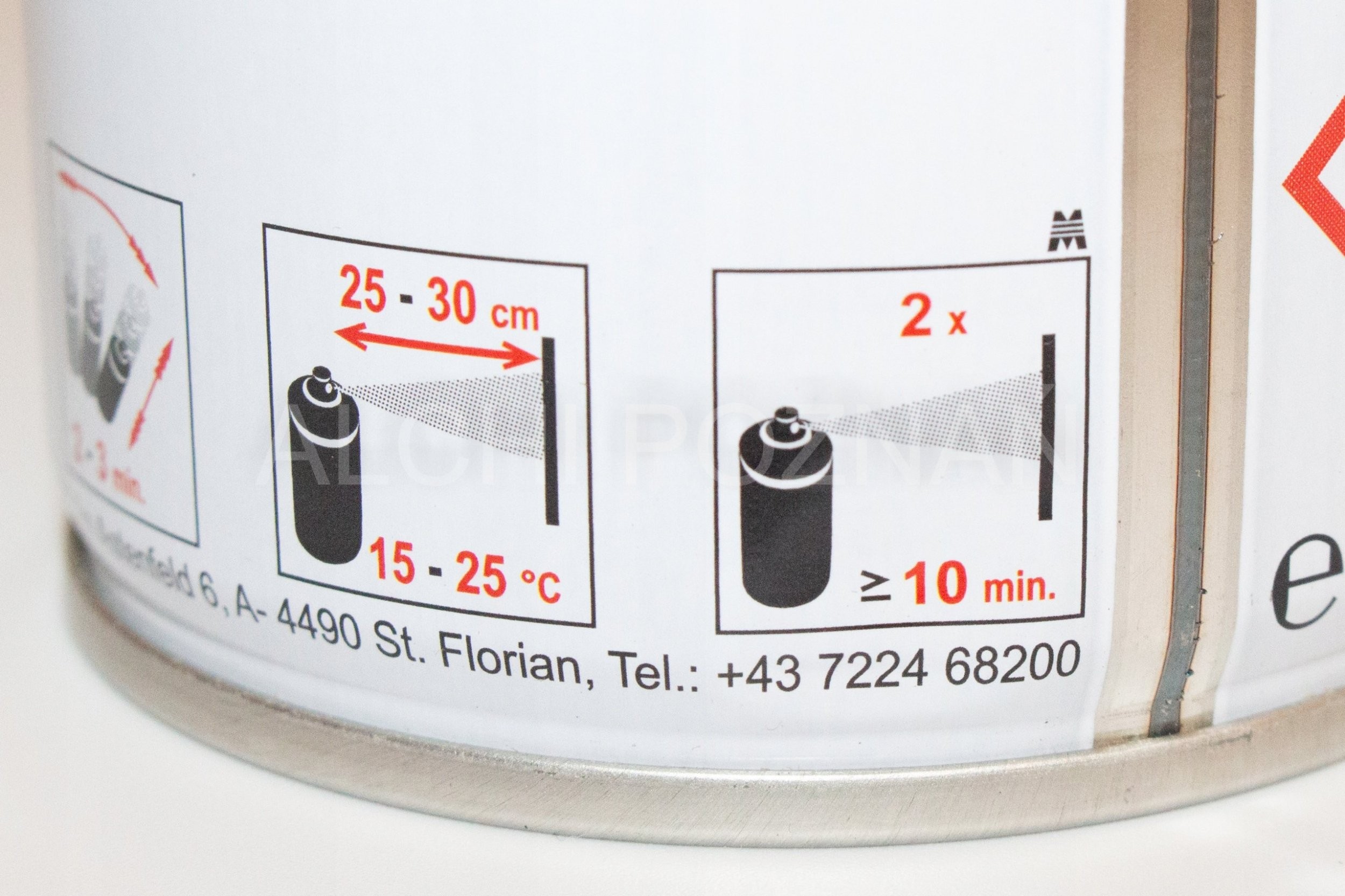 Powierzchnia musi być czysta, sucha i odtłuszczona. Przed użyciem wstrząsnąć przez ok. 2-3 minuty. Następnie rozpylać z odległości ok. 25-30 cm, przy temperaturze pojemnika 15-25 st. C. Lakier należy nanosić równomiernie, spryskując powierzchnię kilkukrotnie cienkimi warstwami. Spray do stosowania wewnątrz budynków. Nie jest odporny na warunki atmosferyczne ani nie zmywa się łatwo.