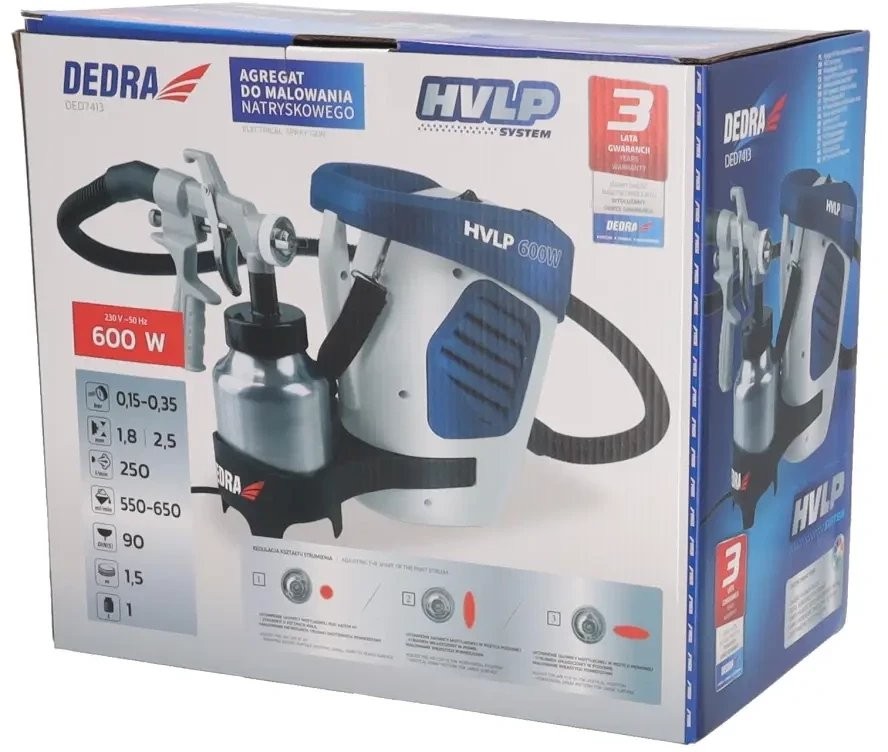 Agregat malarski HVLP do malowania natryskowego, DEDRA DED7413 600W, zbiornik 1L, dysza 1,8mm i 2,5mm