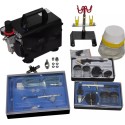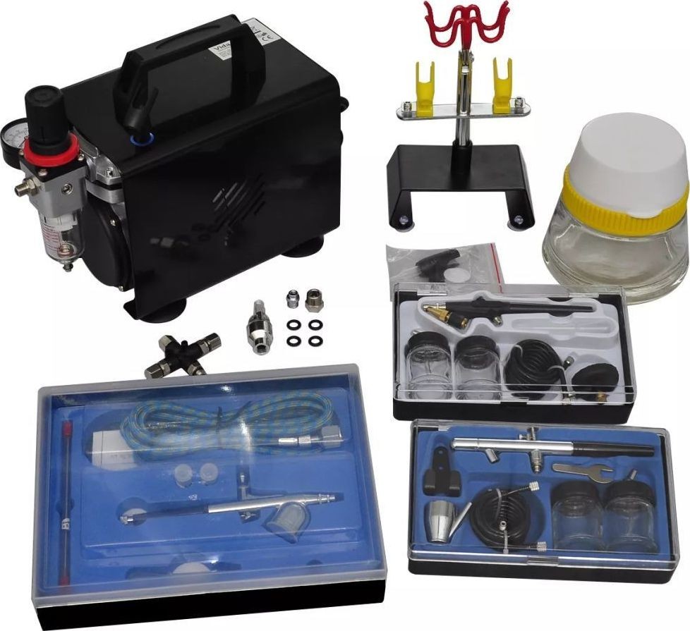 Ten profesjonalny zestaw do malowania natryskowego składa się z mini kompresora, trzech pistoletów natryskowych i innych akcesoriów: