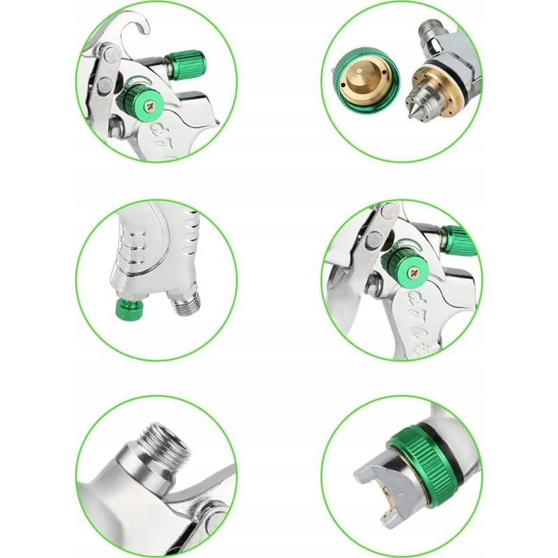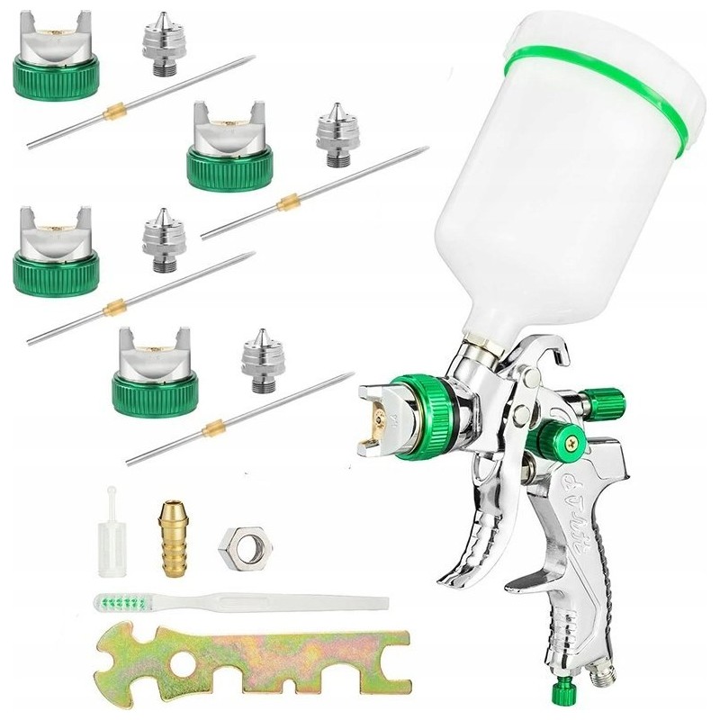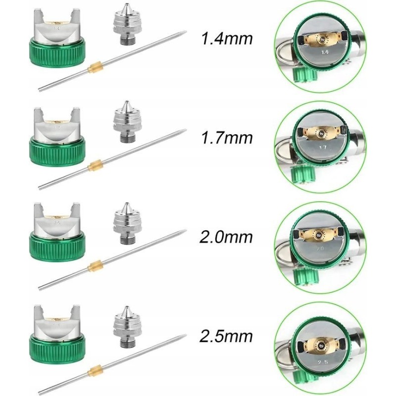 ✅ Różne Dysze: Cztery różne dysze z iglicami (1,4 + 1,7 + 2,0 + 2,5) pozwalają na dostosowanie pistoletu do różnych rodzajów prac lakierniczych.