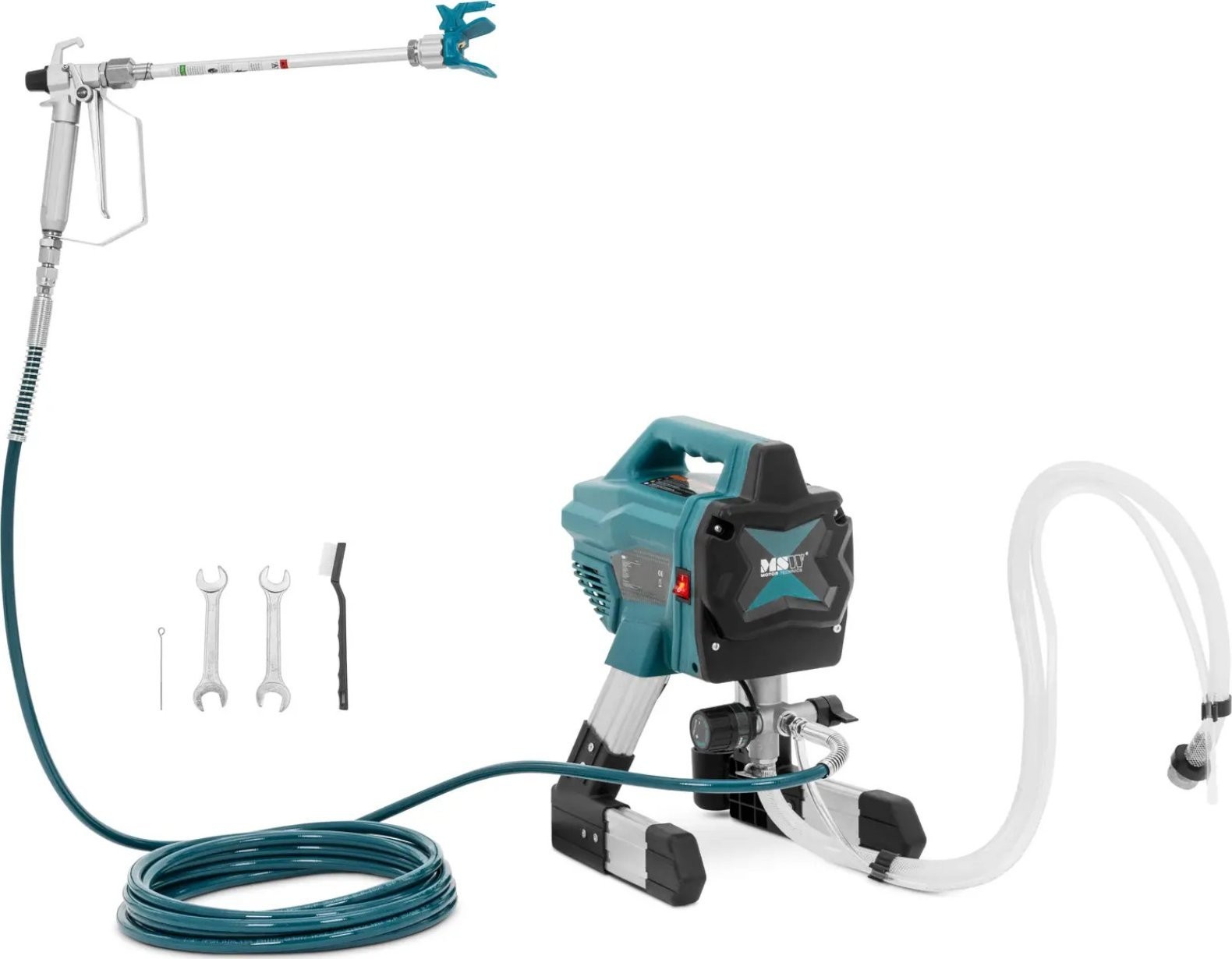 Agregat malarski hydrodynamiczny marki MSW pozwoli przyspieszyć malowanie ścian. Kompaktowe urządzenie daje maksymalną kontrolę nad aplikacją i zapewnia profesjonalny efekt bez smug na ścianach domu lub pomieszczeń. Sprzęt można obsłużyć bez problemów, a to za sprawą przełączników i pokręteł z czytelnymi symbolami. Dzięki temu agregat hydrodynamiczny nada się zarówno do projektów domowych, jak i profesjonalnych usług oraz prac malarskich. Niewymagający konserwacji, bezszczotkowy silnik o mocy 650 W pracuje wydajnie z prędkością do 1300 obr./min i rozprowadza maksymalnie 1,4 litra farby na minutę w postaci delikatnej mgiełki. Za pomocą poręcznego pokrętła można określić ciśnienie, a tym samym nakładanie farby, aż do 200 barów. To pozwoli dostosować maszynę w zależności od projektu, farby i pożądanego rezultatu. Elastyczny wąż o długości 7,5 m zapewni dużą swobodę pracy. Dołączona przedłużka zadba o jeszcze większą elastyczność, a praktyczny uchwyt do przenoszenia ułatwi transport agregatu do miejsca użytkowania. Kompaktowy sprzęt nie zajmie wiele miejsca w czasie transportu oraz przechowywania do następnego projektu malarskiego. Dzięki zaawansowanej technologii wbudowana wysokociśnieniowa pompa tłokowa działa niezawodnie. Minimalizuje ona ryzyko zatorów i zapewnia równomierne nakładanie farby lateksowej i elewacyjnej, bejcy czy podkładu. Ponadto agregat malarski ma budowę modułową. Wszystkie elementy można odkręcić w kilka chwil. Pozwala to szybko usunąć usterki i łatwo wymienić zużyte części. Zapewni to łatwą konserwację urządzenia i oszczędzi wydatków.