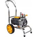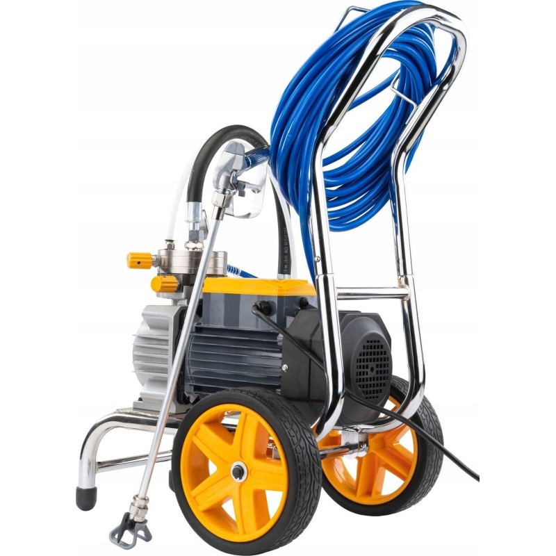 Hydrodynamiczny agregat malarski to urządzenie o mocy 1500 W, zasilane napięciem 230 V / 50 Hz, osiągające maksymalne ciśnienie robocze do 225 bar. Dzięki wysokiemu ciśnieniu umożliwia szybkie i równomierne nakładanie farby na duże powierzchnie, zapewniając precyzyjne wykończenie i minimalizując straty materiału.