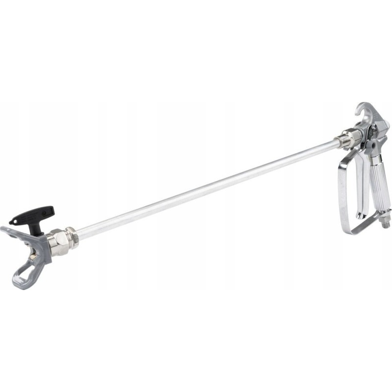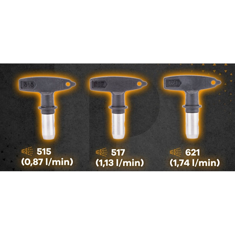 Nasz pistolet, który jest częścią zestawu, jest kompatybilny z różnymi dyszami oferowanymi przez różnych producentów. W skład zestawu wchodzi między innymi dysza 517, doskonale sprawdzająca się do nakładania farb emulsyjnych i lateksowych.