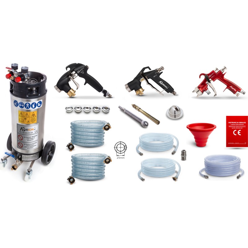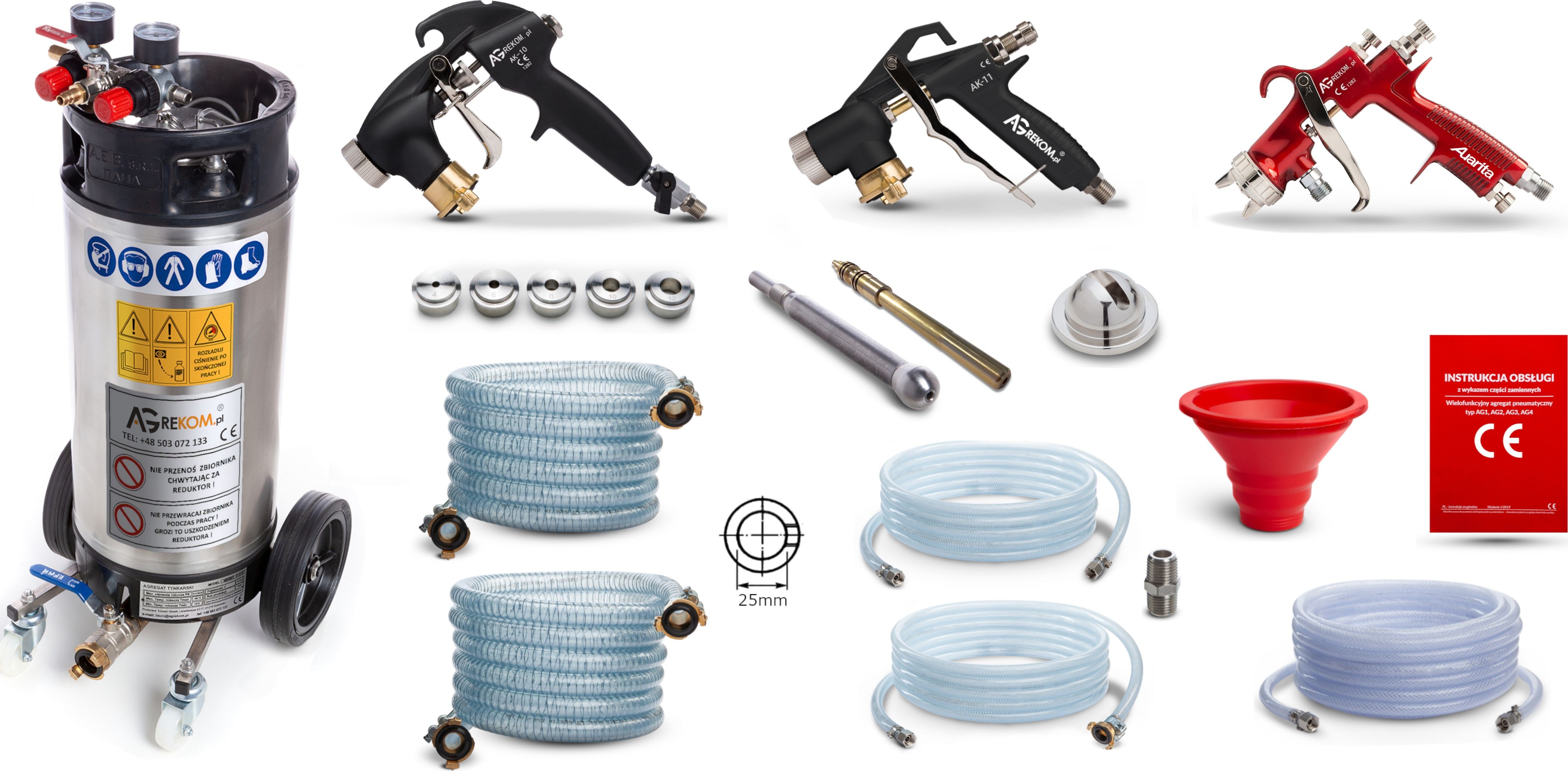 - 10 m węża zbrojonego z okuciami do podłączania powietrza w pistoletach,