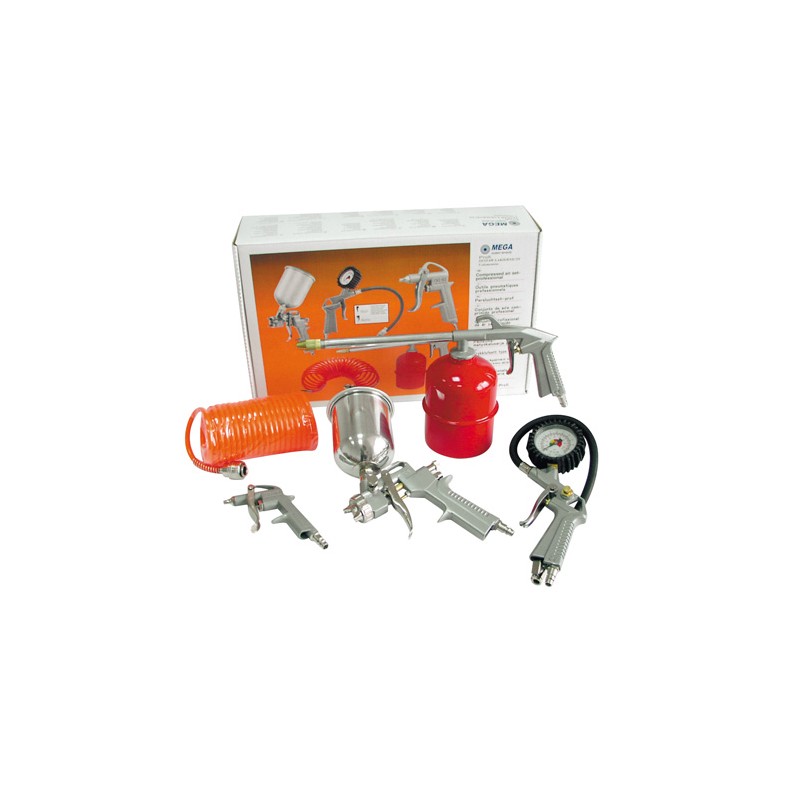 - W zestawie: pistolet do pompowania kół, pistolet do mycia, pistolet lakierniczy (do wszelkiego typu farb), spiralny wąż 5 m