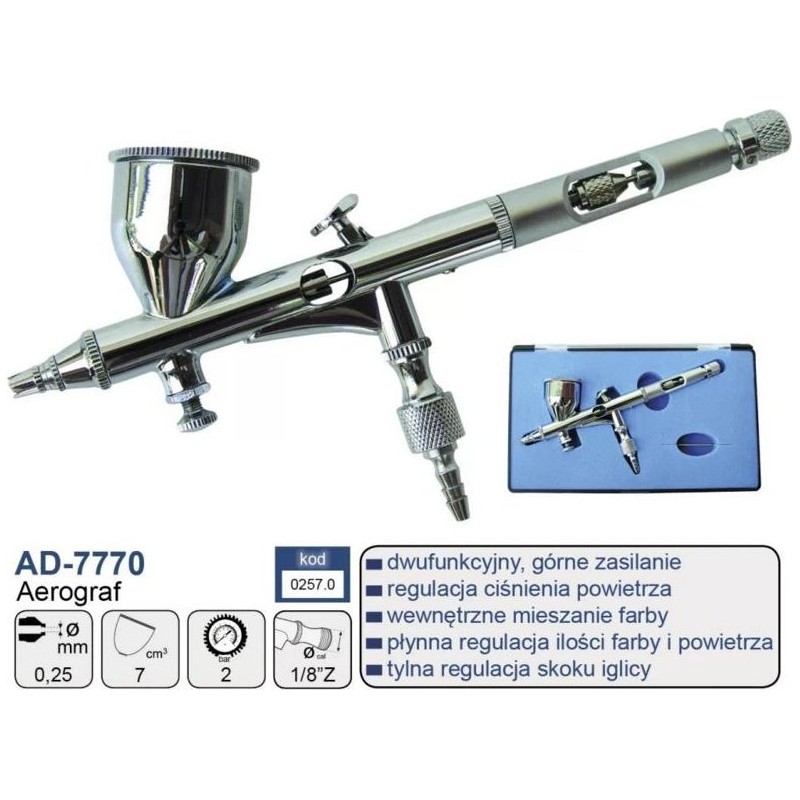Model AD-7770 posiada rozbudowaną zaawansowaną konstrukcję. Duża precyzja w malowaniu cienkich linii i punktów. Pozwala dokładnie panować nad strumieniem farby. Model dla zaawansowanych użytkowników.
