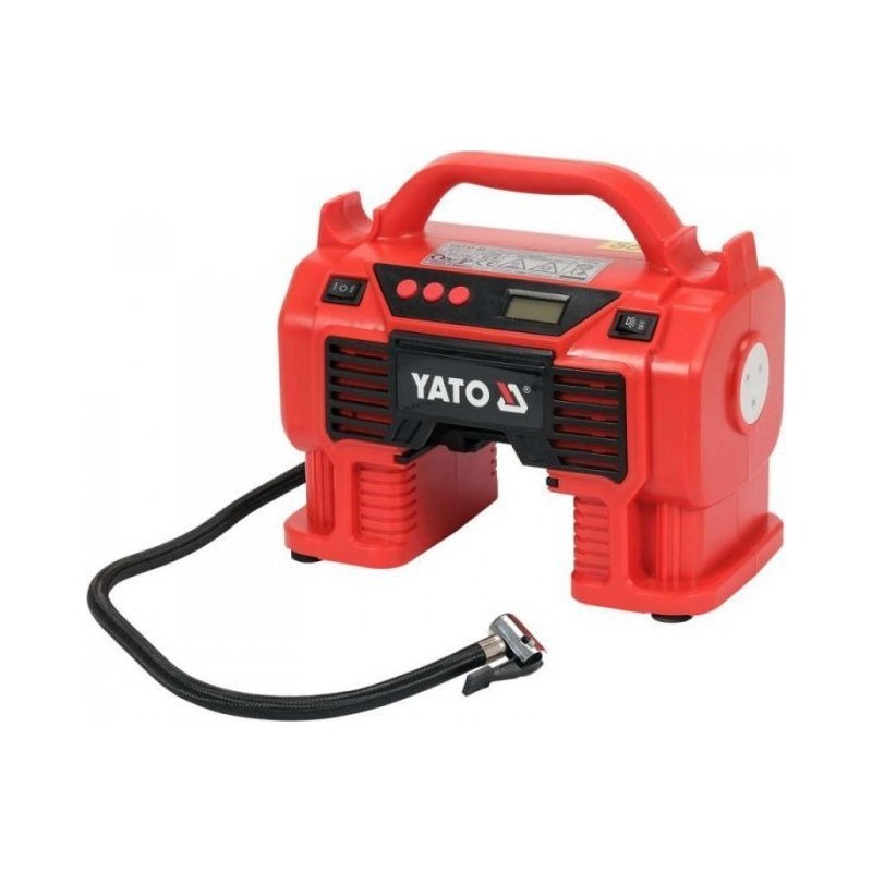 Kompaktowy kompresor zasilany baterią systemu YATO 18 V oraz prądem z gniazda zapalniczki 12 V. Urządzenie bez akumulatora.