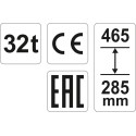- Udźwig podnośnika wynosi 32 tony, a zakres podnoszenia wynosi od 285mm do 465mm