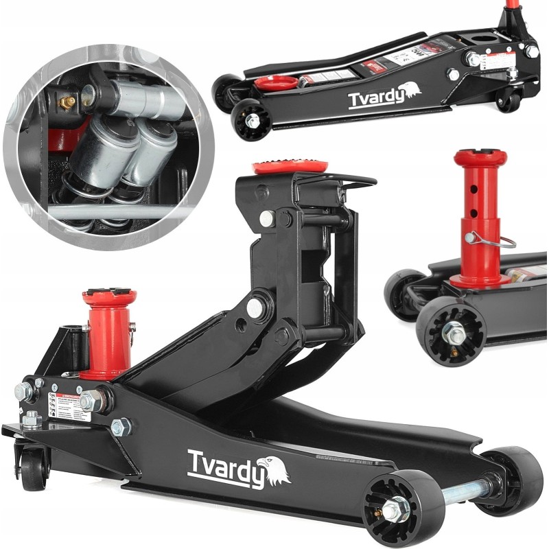 Profesjonalny podnośnik samochodowy niskoprofilowy z pompą hydrauliczną marki Tvardy - idealne rozwiązanie dla mechaników i warsztatów samochodowych.