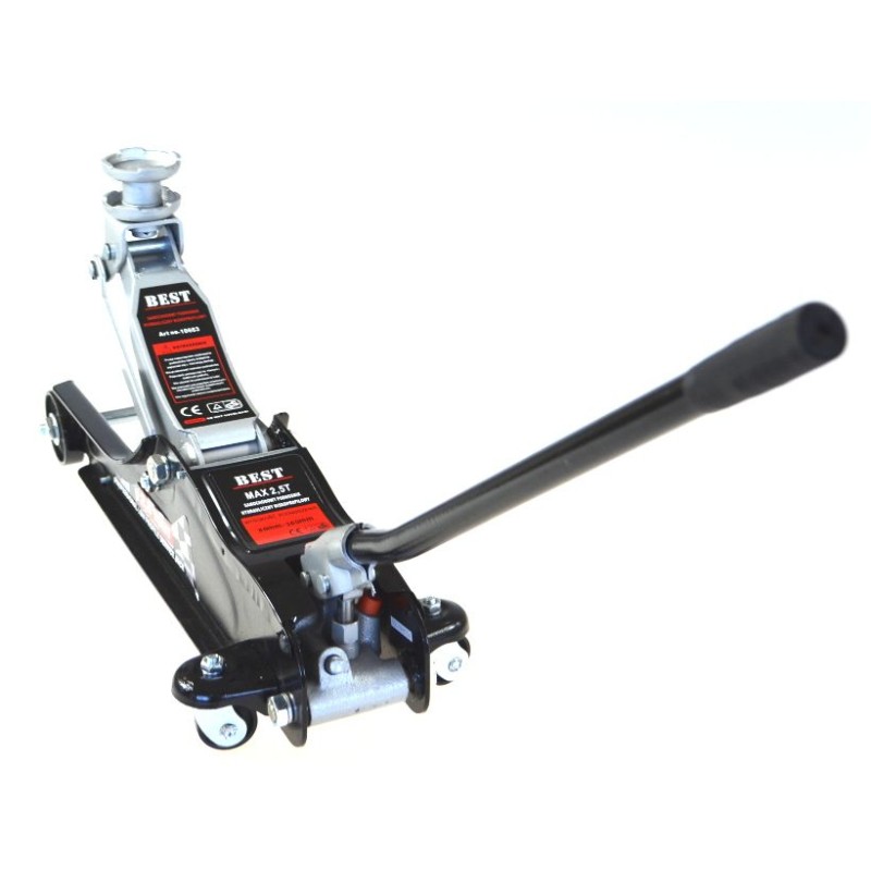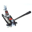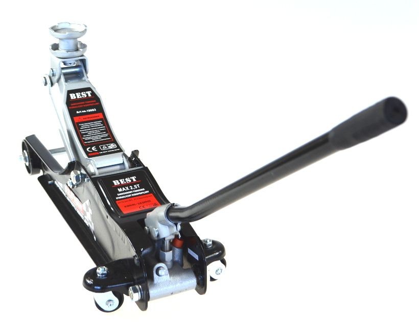 Podnośnik posiada masywne, metalowe kółka przednie oraz kierowane i łożyskowane kółka tylne, które zapewniają stabilną pracę i łatwą manewrowość.
