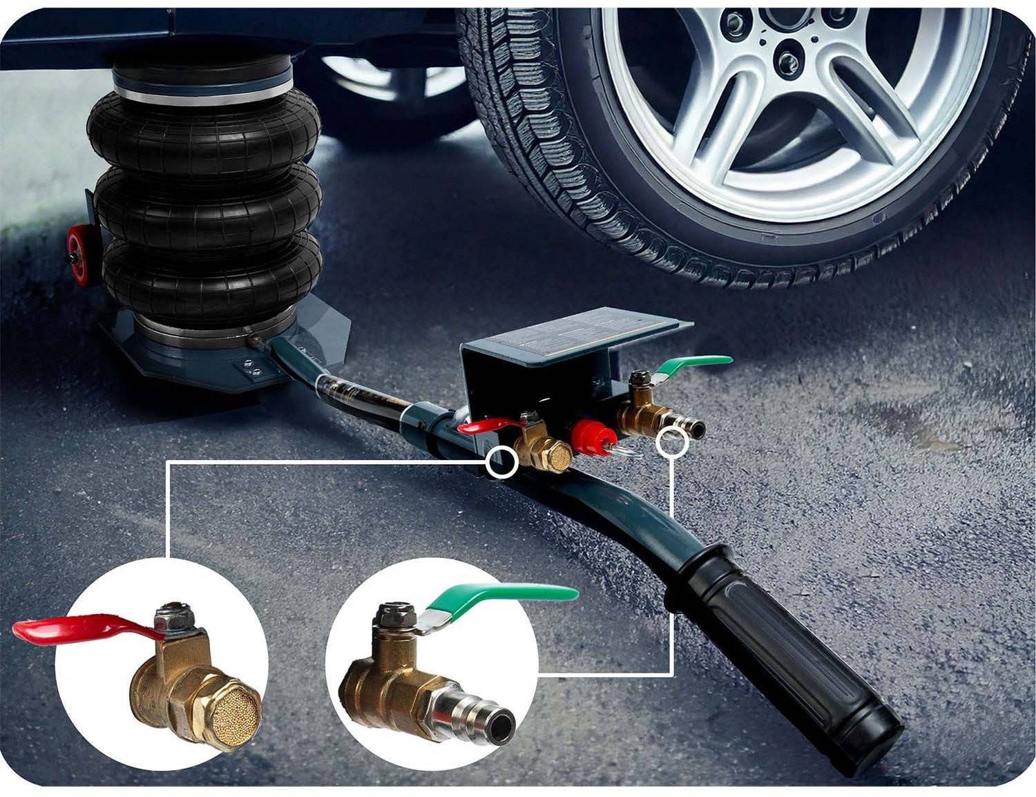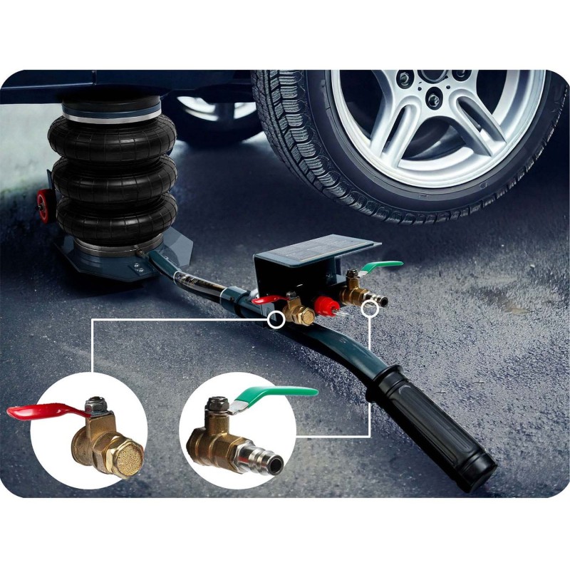 - Zawór czerwony (spustowy) – wypuszcza powietrze, opuszczając podnośnik.