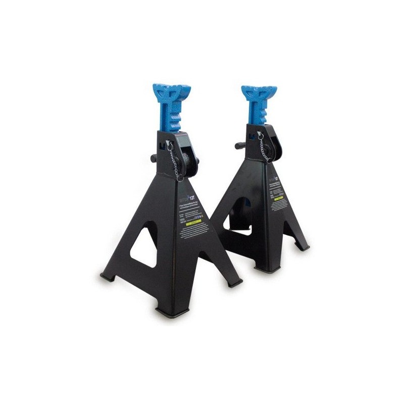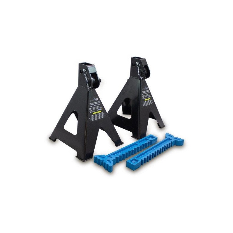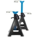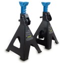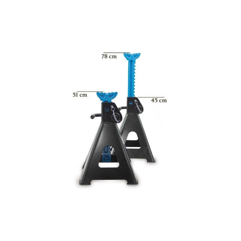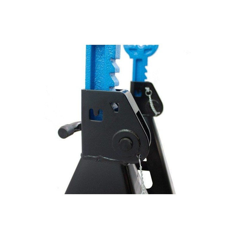 Bezpieczeństwo użytkowania zwiększają bolce zabezpieczające, które chronią przed przypadkowym obniżeniem się kobyłek. Produkt znajdzie zastosowanie zarówno w profesjonalnych warsztatach, jak i domowych garażach, dostarczając trwałości i niezawodności podczas każdej pracy. Dzięki czarnemu i niebieskiemu wykończeniu, kobyłki łamią monotonię standardowego wyposażenia, dodając elegancki akcent do Twojego miejsca pracy.
