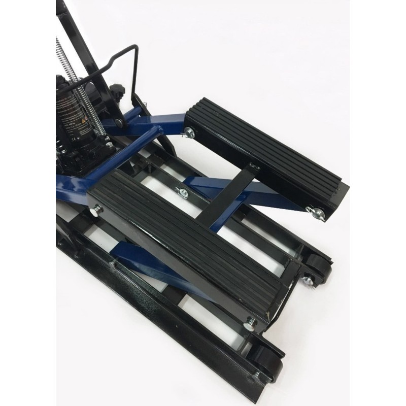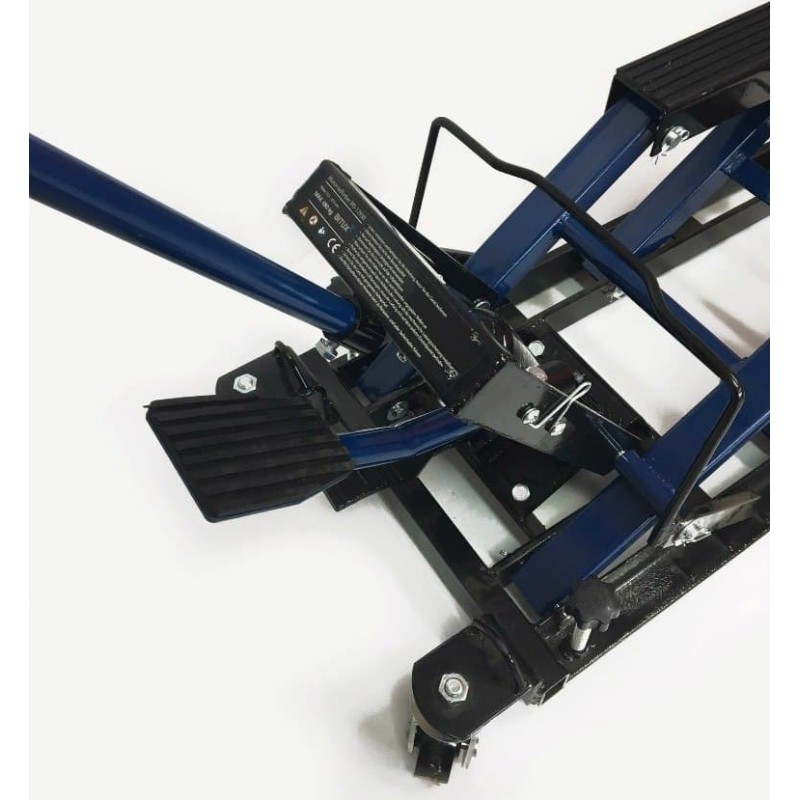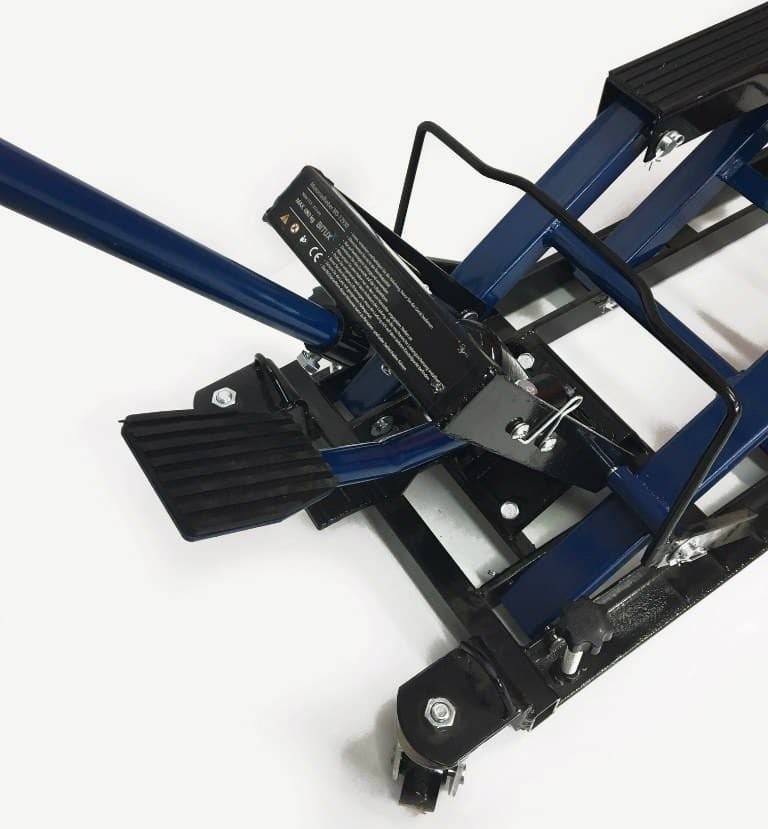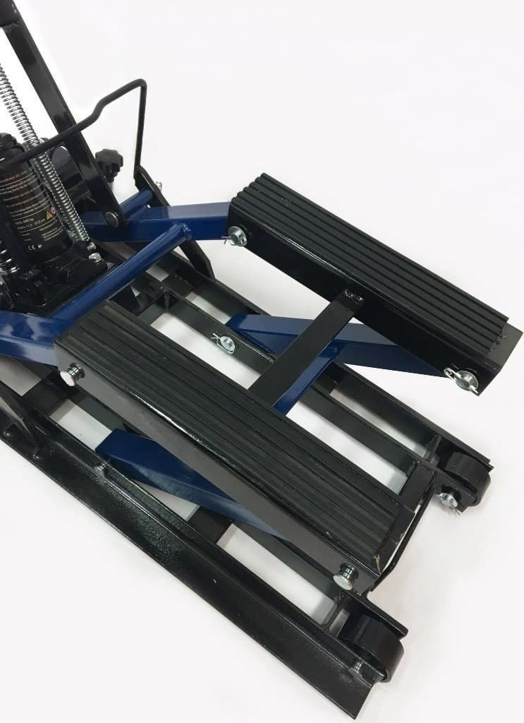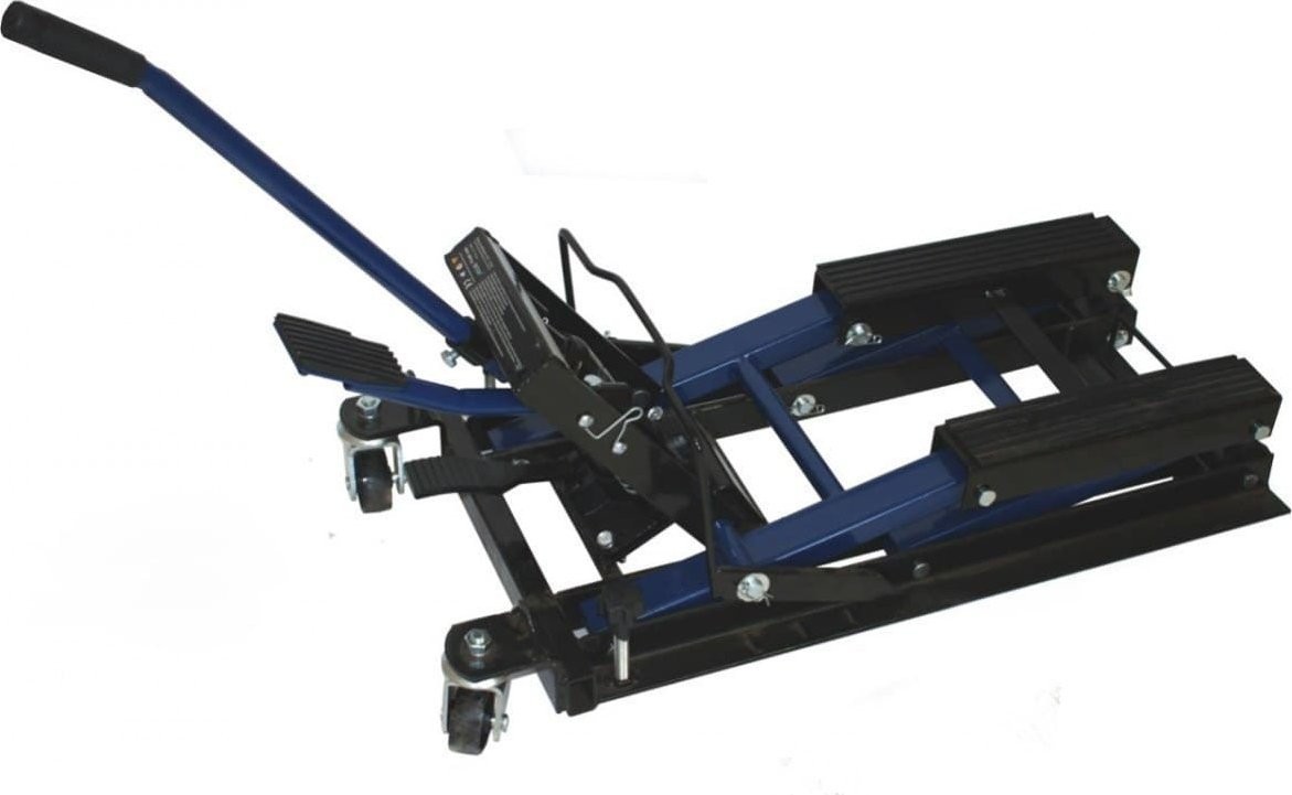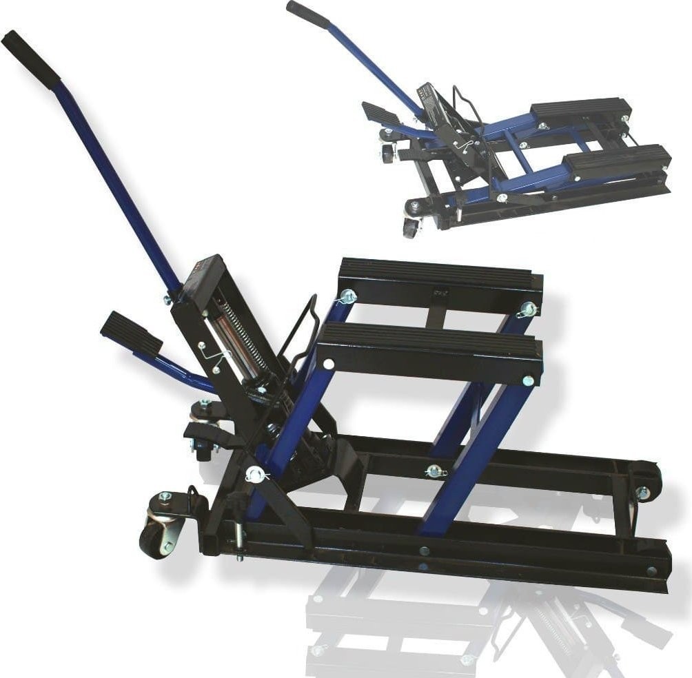 Podnośnik o wielu zastosowaniach, dzięki niemu podniesiesz motocykle, quady, itd. Niskoprofilowa platforma doskonale sprawdzi się przy podnoszeniu i opuszczaniu pojazdów w celu napraw. Posiada dwa skrętne kółka i śruby stabilizujące. Nożycowy podnośnik do motocykli z mechanizmem hydraulicznym jest bardzo wytrzymały i wykonany z najwyższej jakości materiałów. Wsporniki pokryte są gumą, aby zapobiec uszkodzeniu ramy pojazdu. Wyposażony w dwie niezależne dźwignie do regulacji wysokości. Możliwość złożenia zaoszczędzi dużo miejsca podczas przechowywania.