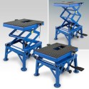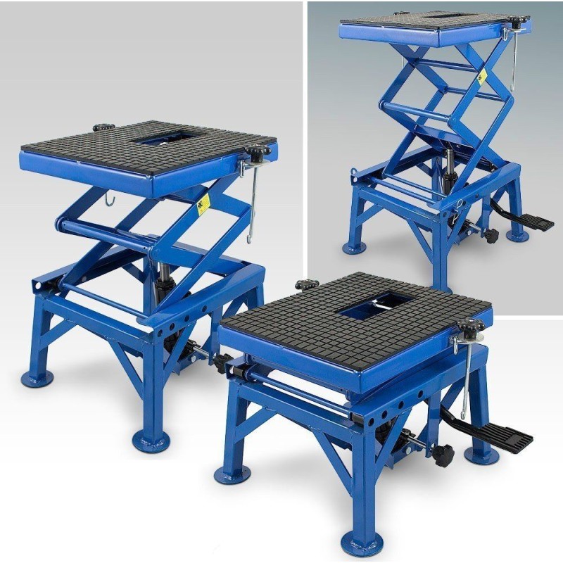Podnośnik nożycowy warsztatowy dla motocykli i quadów. Idealny do serwisowania i napraw. Sprawdzi się w garażu jak i zarówno w profesjonalnym warsztacie. Podnośnik posiada 3 -stopniową regulację wysokości (60 cm, 75cm i 87 cm), pedał umożliwia zablokowanie na pożądanej wysokości. Platforma wyściełana jest gumą co zapewnia stabilną pozycję podnoszonego przedmiotu.