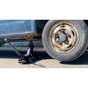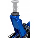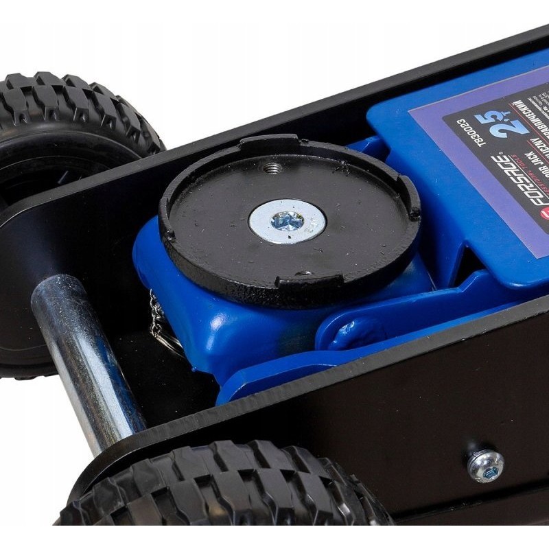 Podnośnik posiada szerokie stalowe koła osi przedniej oraz łożyskowane koła skrętne osi tylnej.