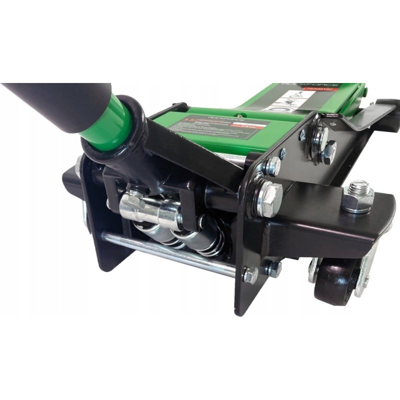 Dzięki odpowiednio zaprojektowanym kółkom, ten podnośnik może być łatwo ustawiony w dowolnym punkcie pod samochodem. Ich konstrukcja znacznie ułatwia manewrowanie tym narzędziem. Ich duża średnica sprawia, że z łatwością będziesz sterować podnośnikiem nawet na trudnych powierzchniach.