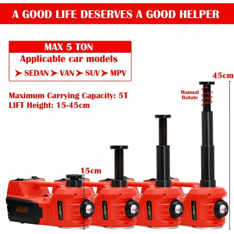 Elektryczny lewarek samochodowy Inncen to niezwykle wszechstronne narzędzie, które łączy w sobie funkcje podnośnika, pompki oraz oświetlenia LED. Z maksymalną nośnością wynoszącą 5 ton oraz zakresem podnoszenia od 15 do 45 cm, idealnie nadaje się do podnoszenia zarówno limuzyn, jak i SUV-ów. To niezbędne urządzenie w sytuacjach awaryjnych, które można łatwo podłączyć do gniazda zapalniczki samochodowej 12V.
