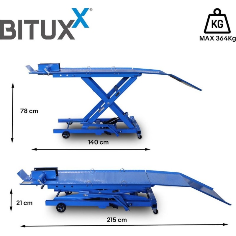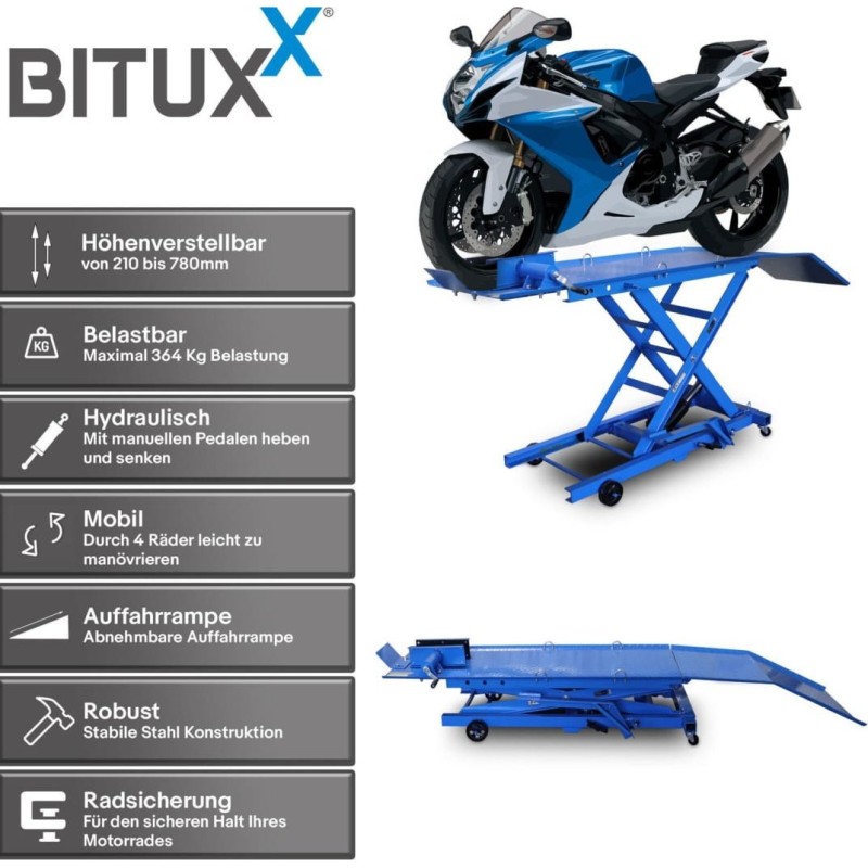 Dzięki hydraulicznemu nożycowemu podnośnikowi motocyklowemu Bituxx konserwacja, naprawy i pielęgnacja Twojego motocykla stają się łatwe.Solidna konstrukcja umożliwia bezpieczną i wygodną pracę, a maksymalny udźwig wynosi 364 kg. Obsługa za pomocą pedału nożnego sprawia, że użytkowanie jest proste i intuicyjne.