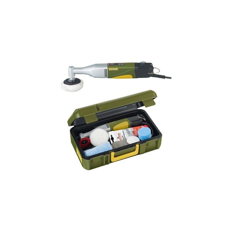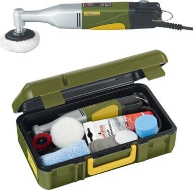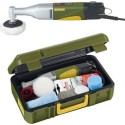 - Urządzenie oferowane w wytrzymałej POLIPROPYLENOWEj walizce z osprzętem: gumowy dysk z haczykiem i pętelką mocującą, gąbka polerująca (średnia twardość), dysk polerujący z owczej wełny, polerujący filc do metalu i metali nieżelaznych (średnia twardość), 12 ściernych dysków K 2000 oraz NIGRIN emulsja polerująca (75 ml), jak również nakładka z mikrofibry.