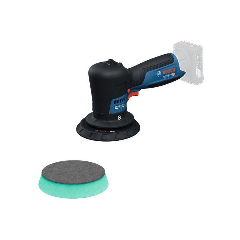 - W zestawie: 1x polerka akumulatorowa, 1x talerz polerski średni 125 mm, 1x talerz wspierający 125 mm (bez akumulatora, bez ładowarki, bez walizki)
