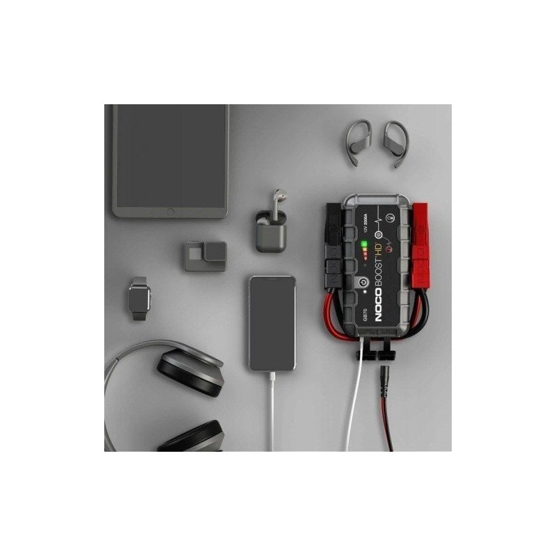 NOCO GB70. Prąd wyjściowy: 15 A, Kolor produktu: Czarny, Prąd rozruchowy: 2000 A. Rodzaj zasilania: Bateria, Czas ładowania: 3 h, Prąd ładowania: 2,1 A. Szerokość produktu: 152 mm, Głębokość produktu: 71,1 mm, Wysokość produktu: 222 mm. Szerokość opakowania: 185 mm, Głębokość opakowania: 123 mm, Wysokość opakowania: 249 mm. Przewody: Micro-USB