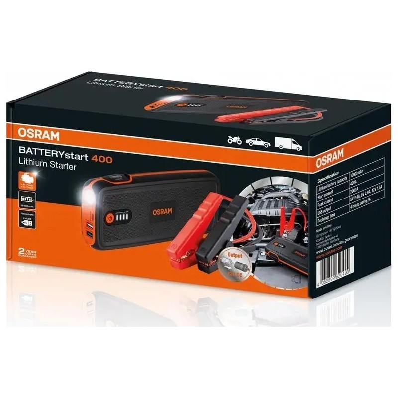 OSRAM BATTERYstart400 to mocny akumulator litowo-kobaltowy LiCoO2 do uruchamiania pojazdów 12 V o pojemności silnika do 8l (benzyna) i 4l (diesel). Kompaktowy bez uszczerbku na innych parametrach, BATTERYstart400 waży tylko 700g i z łatwością można go przechowywać w schowku na rękawiczki.