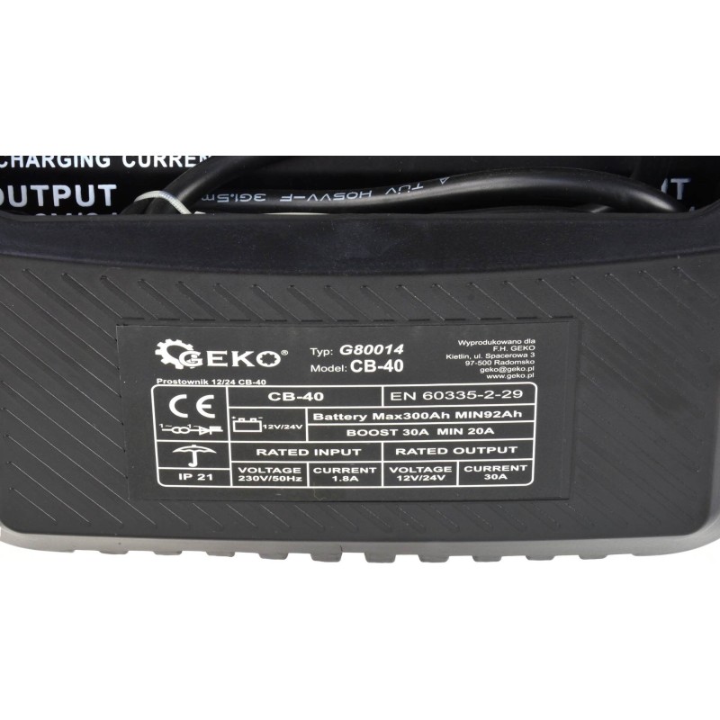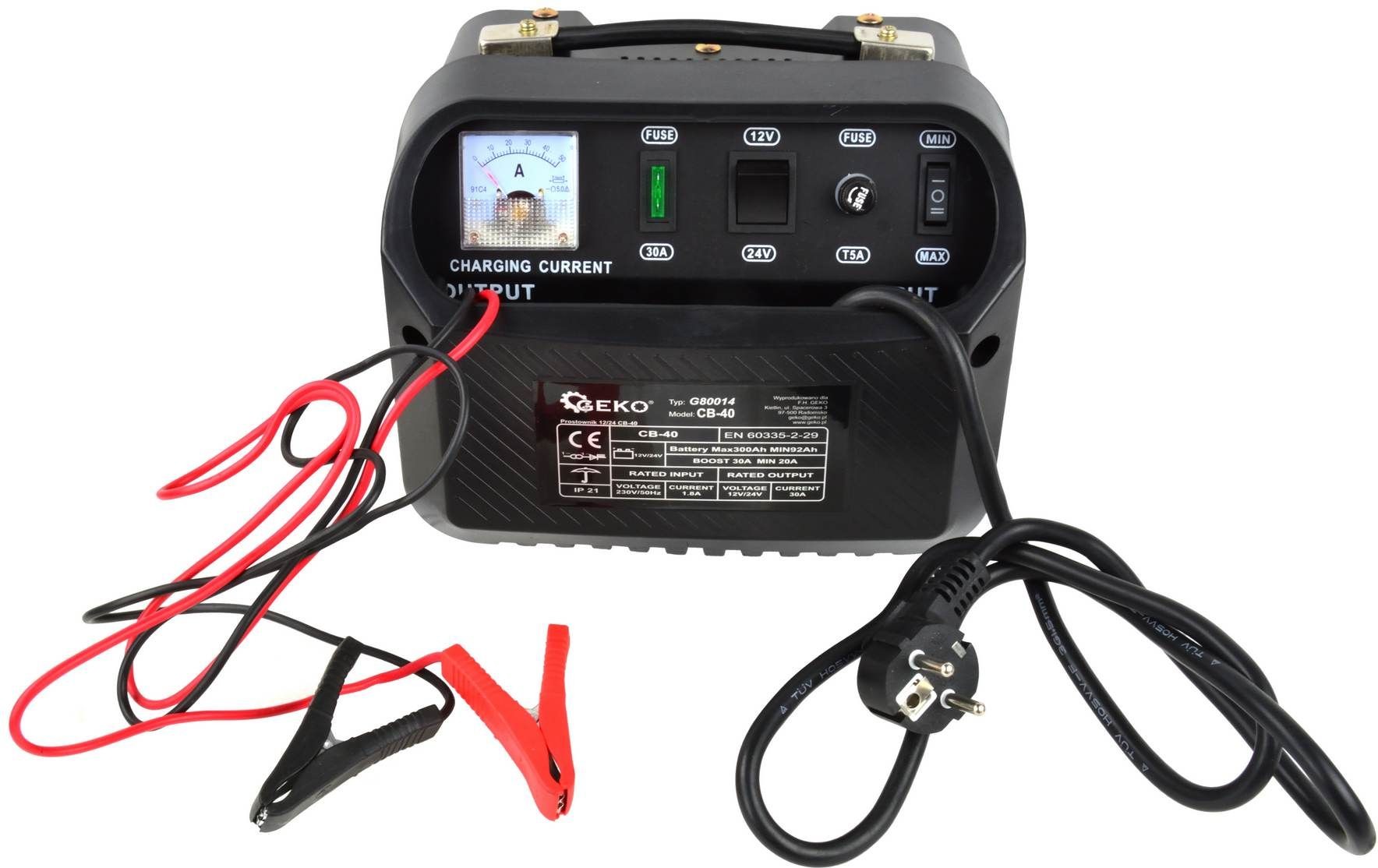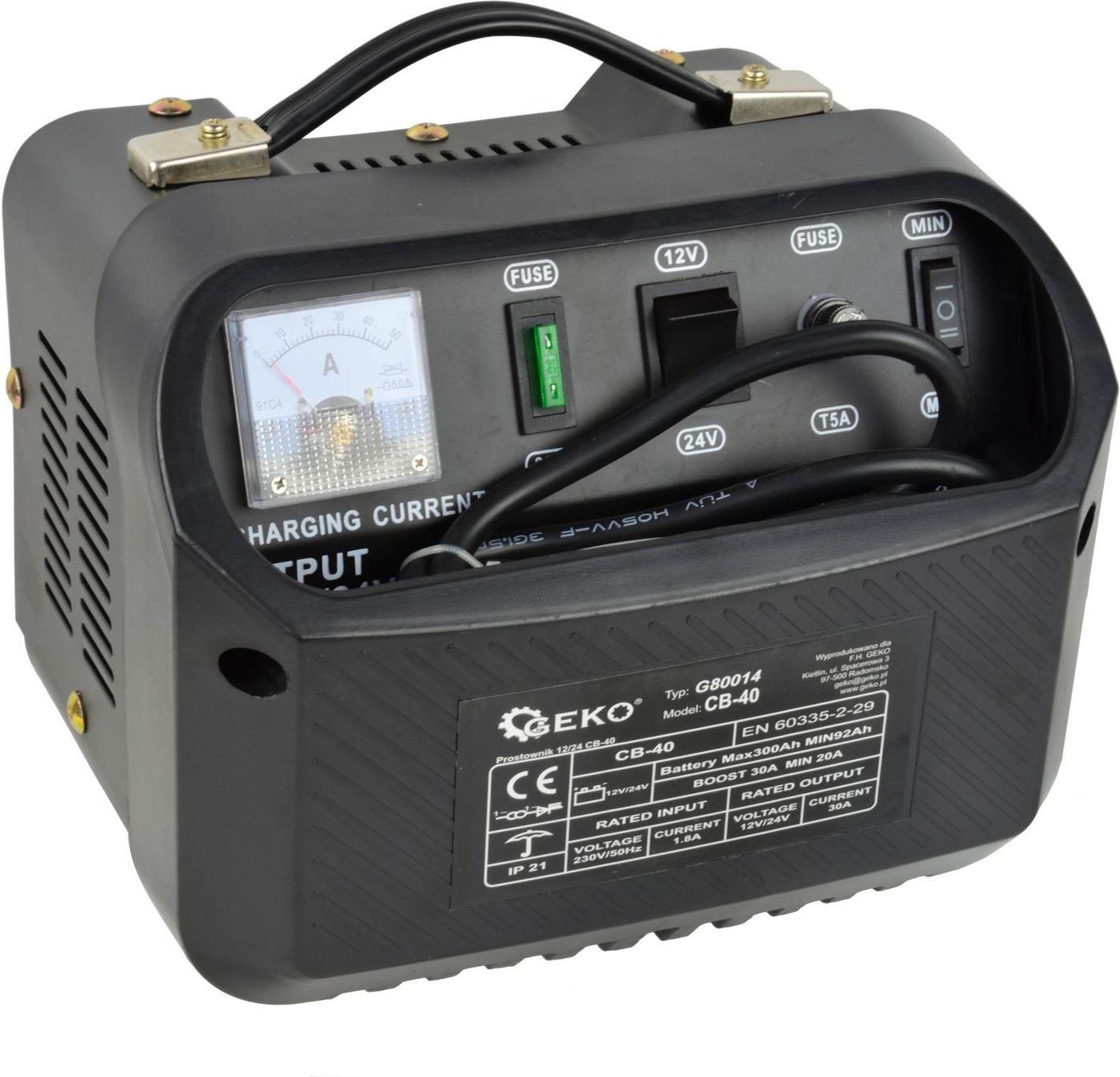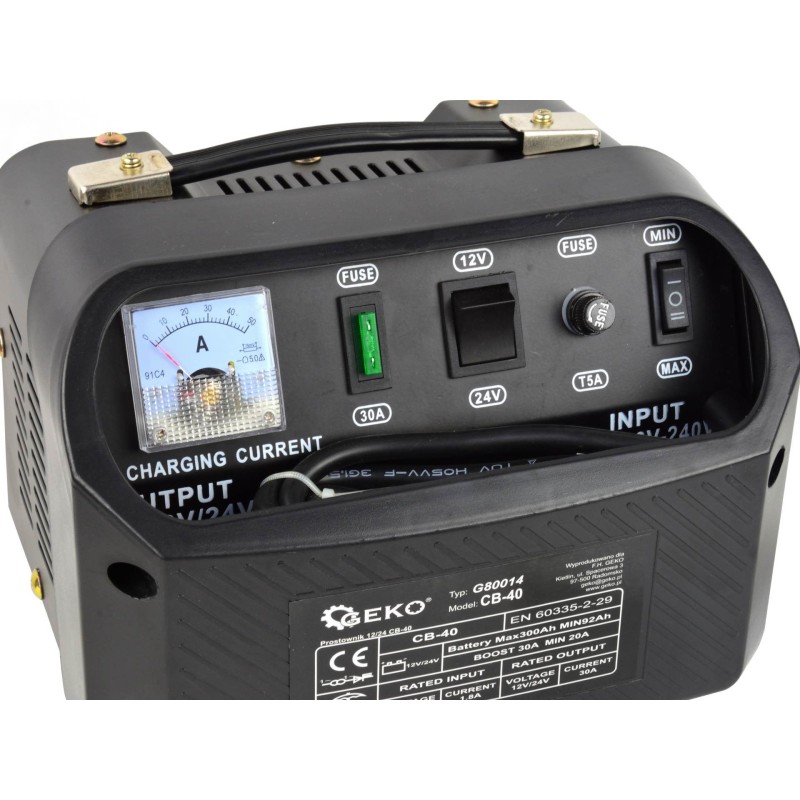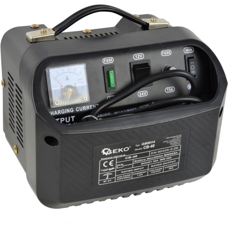 Prostownik samochodowy 12/24V CB-40 Prostownik samochodowy CB-40 przeznaczony do ładowania akumulatorów ołowiowo-kwasowych(STD) o napięciu 12V lub 24V , stosowanych m. in. w samochodach osobowych, dostawczych, ciężarowych itp. Posiada wbudowany bezpiecznik, który chroni urządzenie przed nieprawidłowym podłączeniem biegunów i zwarciem. Cechy produktu: starannie wykonany ergonomiczny uchwyt do przenoszenia posiada wbudowany bezpiecznik 30A typu UNI, oraz bezpiecznik topikowy 5A ładuje akumulatory o pojemności od 92 do 300 Ah napięcie ładowania 12V / 24V Specyfikacja techniczna: Napięcie zasilania: 230V / 50 Hz Napięcie ładowania: 12 / 24V Prąd ładowania: 20A – 30A Pojemność obsługiwanych akumulatorów: 92 - 300 Ah Stopień ochrony: IP 21 Zabezpieczenia: Bezpiecznik 30A typu UNI, bezpiecznik topikowy 5A Wyposażenie: kable rozruchowe, 2x bezpiecznik typu UNI, 2x bezpiecznik topikowy