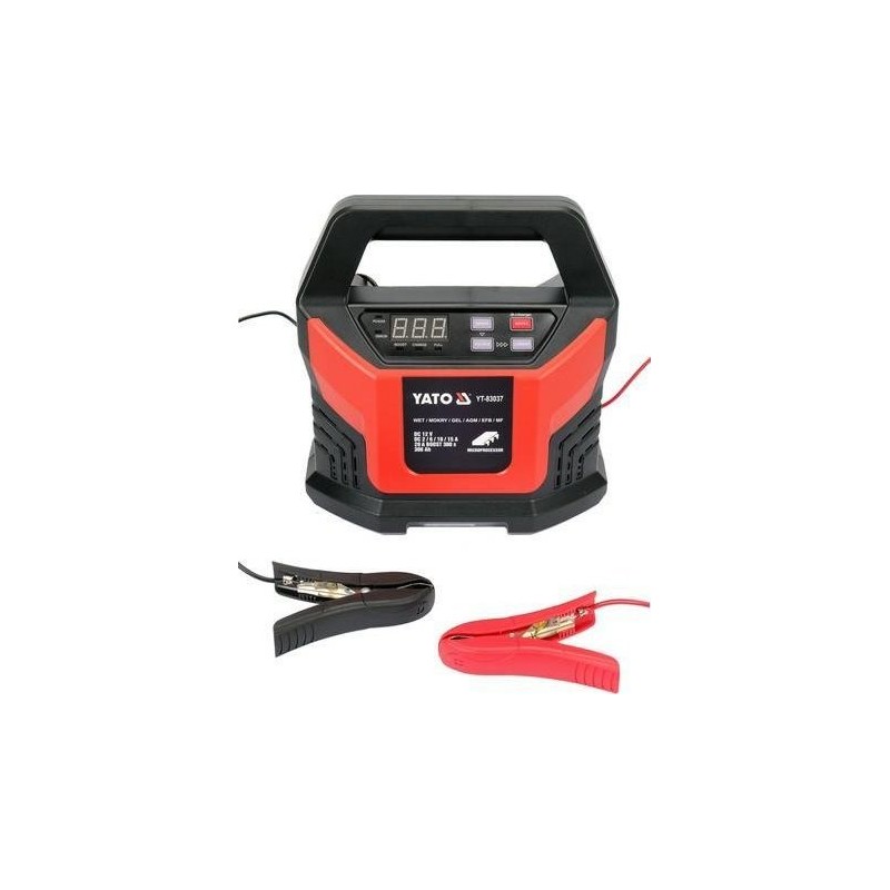 Prostowniki elektroniczny YT-83037 to profesjonalne urządzenie do ładowania akumulatorów 12 V w motocyklach, samochodach osobowych i dostawczych, traktorach, łodziach motorowych. Umożliwiają naładowanie tzw. akumulatorów mokrych, akumulatorów żelowych, AGM, EFB oraz MF