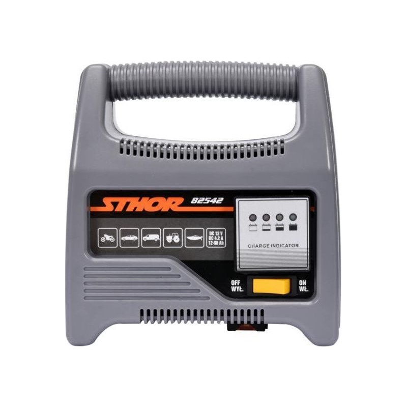 Prostownik marki STHOR posiada transformator toroidalny, zabezpieczenie bezpiecznikiem przed przeładowaniem i przepięciem, włącznik prądowy, ledowy wskaźnik naładowania.
