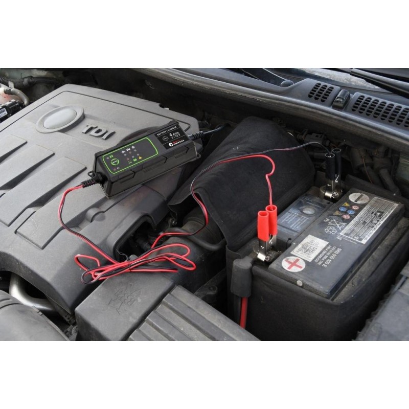Ładowarka automatycznie wykrywa, czy podłączony jest akumulator 6V lub 12V. Podłączając akumulator 12V można wybrać standardowy lub zimowy tryb ładowania. Po naładowaniu akumulatora ładowanie zostaje przerwane, a ładowarka przechodzi w tryb konserwacji, w którym mikroprocesor kontroluje ładowanie impulsowe, aby akumulator był naładowany. Stabilny prąd ładowania 4 A, wysoka sprawność (85%). Kompaktowy rozmiar pozwala na idealne użytkowanie w domu, w podróży oraz w garażu. Ładuje wszystkie typy akumulatorów ołowiowych (Pb) 6 / 12V - bezobsługowe GEL (żel), AGM, MF, VRLA, konserwacyjne PbWet i PbCa. Ładowanie impulsowe wydłuża żywotność baterii i utrzymuje ją w lepszym stanie.